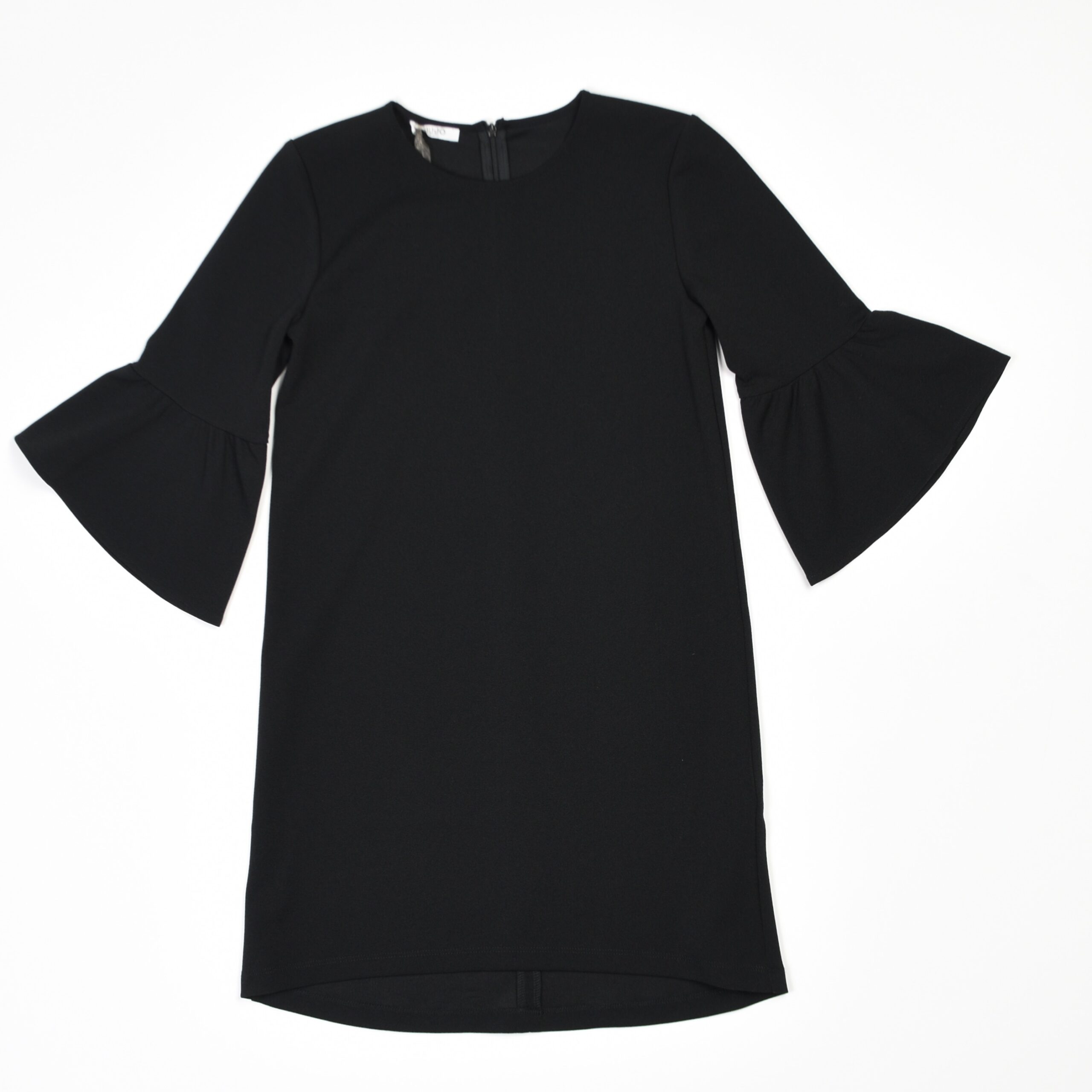 Abito corto nero in tessuto fluido con maniche a tre quarti caratterizzate da volant svasati. Modello dalla linea elegante e minimal, con scollo tondo e chiusura a zip sul retro. Un capo versatile, perfetto da indossare nelle occasioni speciali o per un look raffinato.