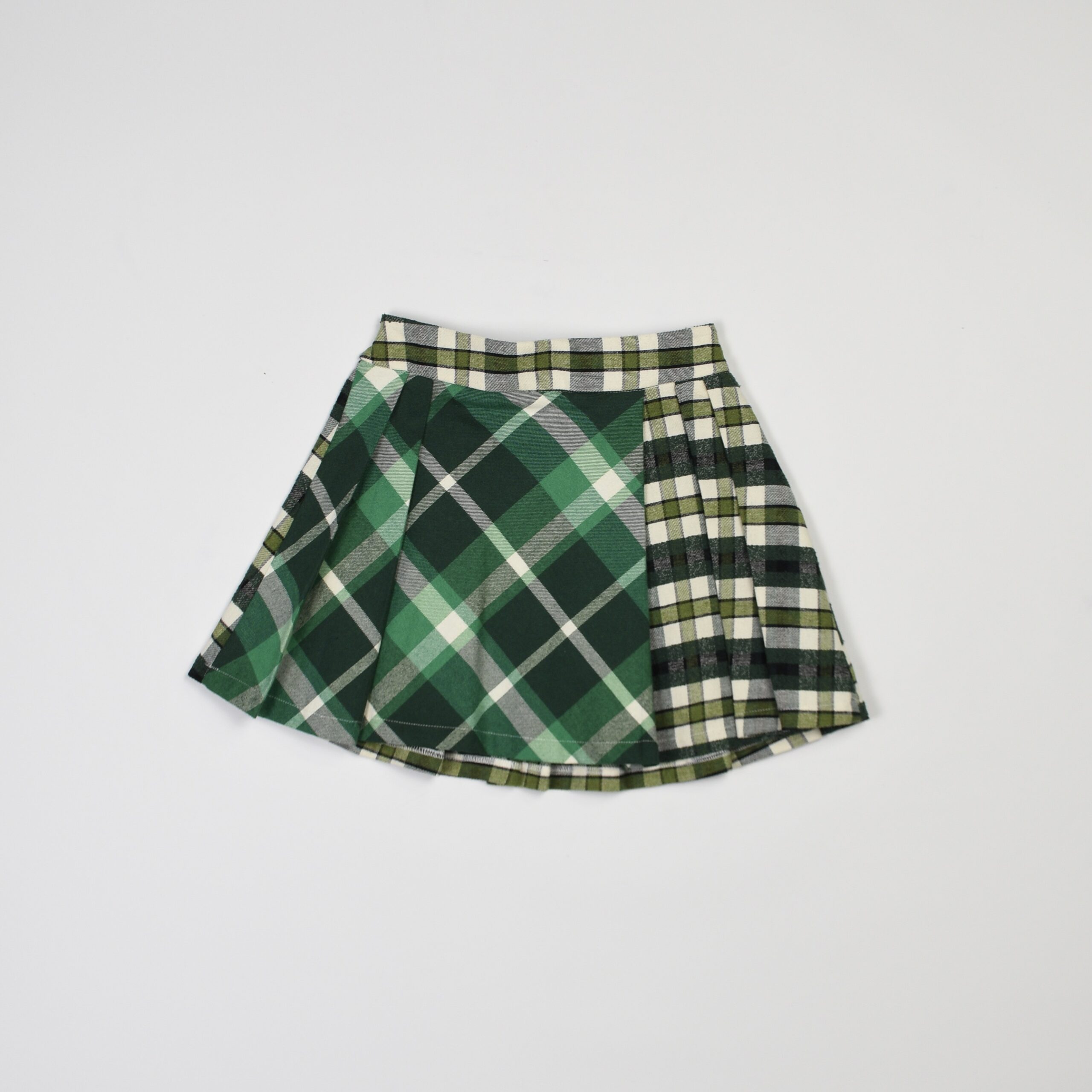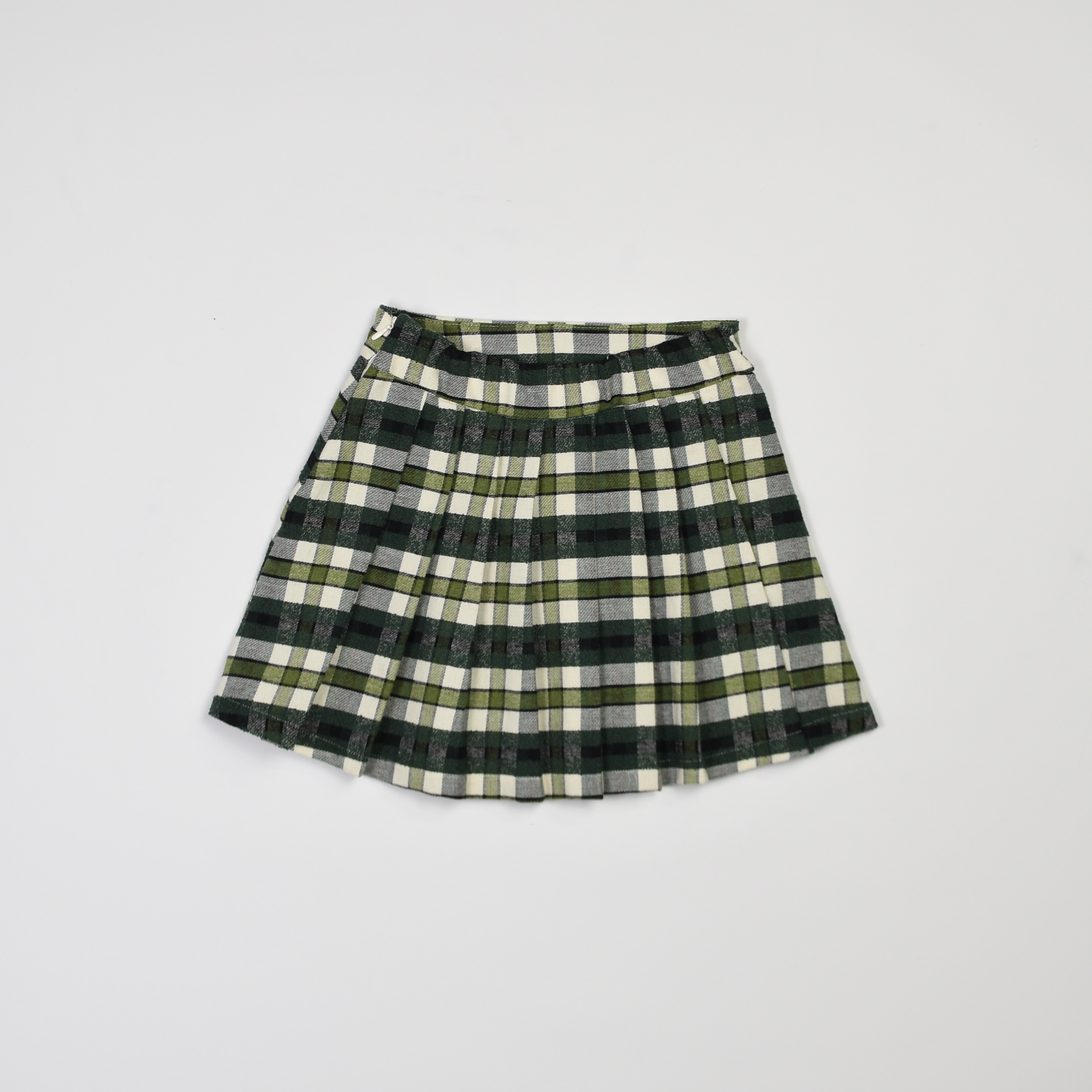 Gonna corta a pieghe con fantasia scozzese sui toni del verde, panna e nero. Il design plissettato dona movimento e un tocco classico, ideale per look eleganti e scolastici rivisitati in chiave moderna. Un capo versatile e alla moda per la stagione invernale.