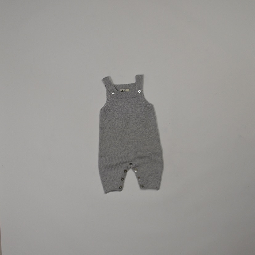 Salopette Maglificio di Verona in morbido tricot color grigio perla, con bretelle chiuse da bottoni e apertura sul cavallo per agevolare il cambio.