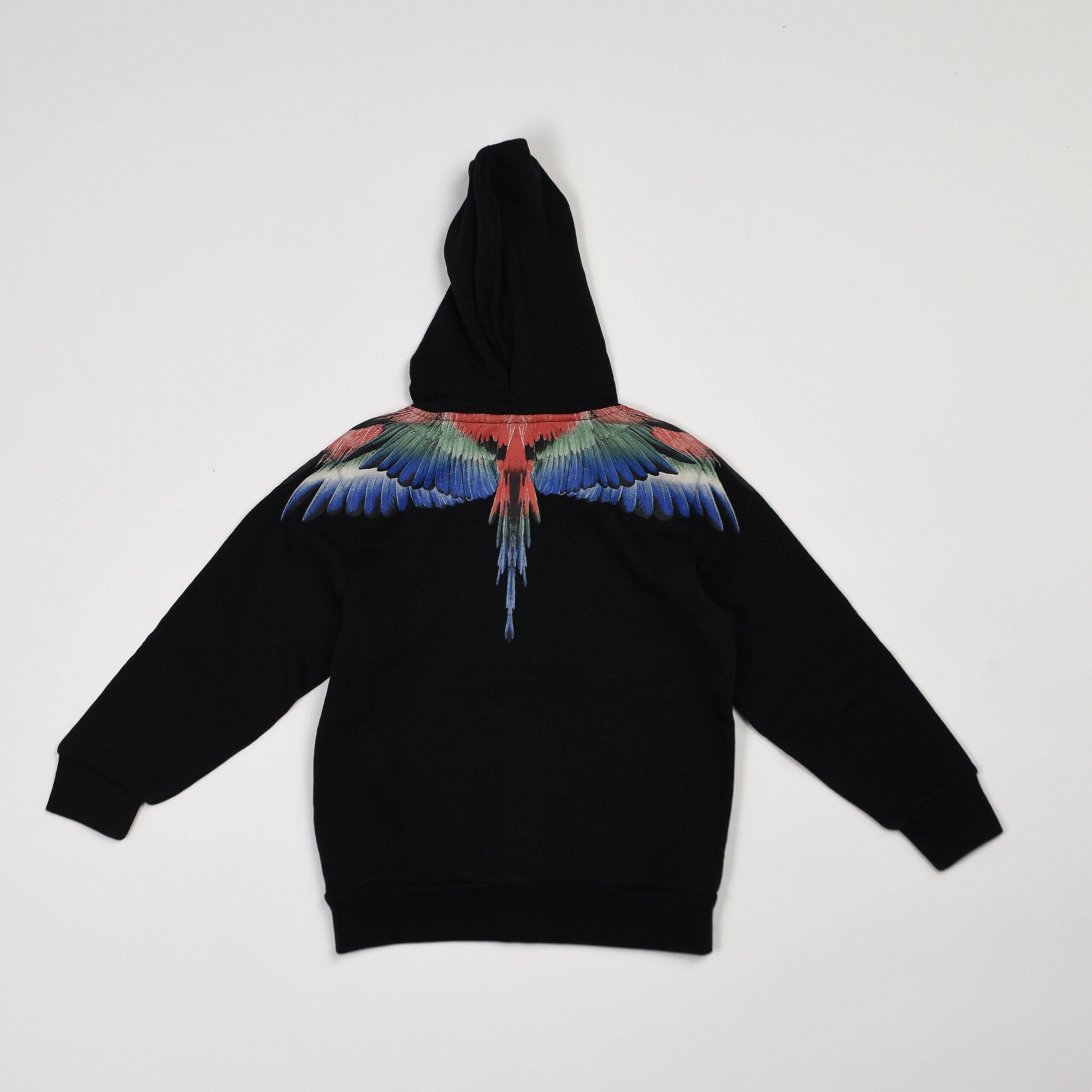 Felpa nera con cappuccio e zip, in cotone, caratterizzata dalla celebre stampa con ali multicolore sul fronte e sulle spalle. Modello con tasche a marsupio, polsini e fondo a costine per un fit confortevole e distintivo.
