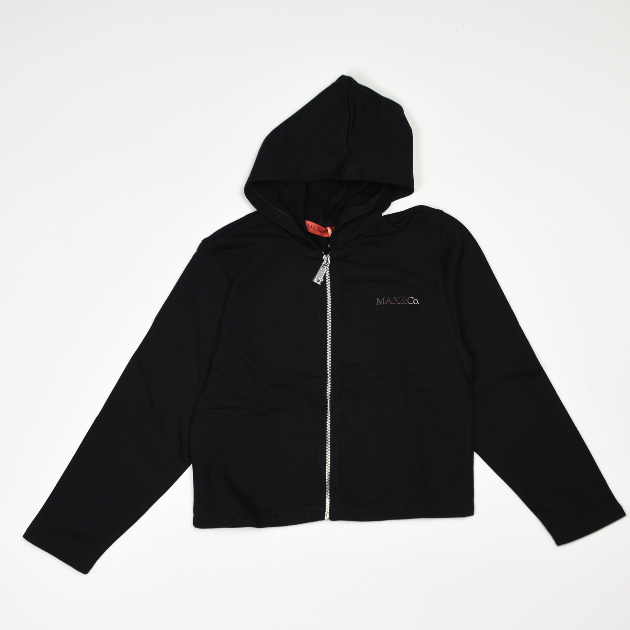 Felpa nera con zip frontale e cappuccio, caratterizzata dal logo discreto Max&Co sul petto. Un capo essenziale e versatile, ideale per completare look casual con un tocco di stile contemporaneo.