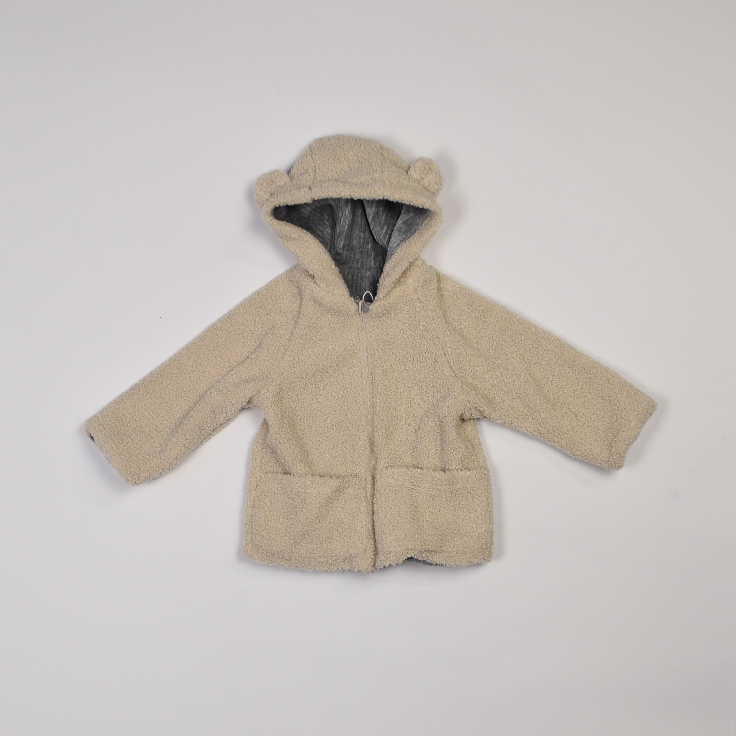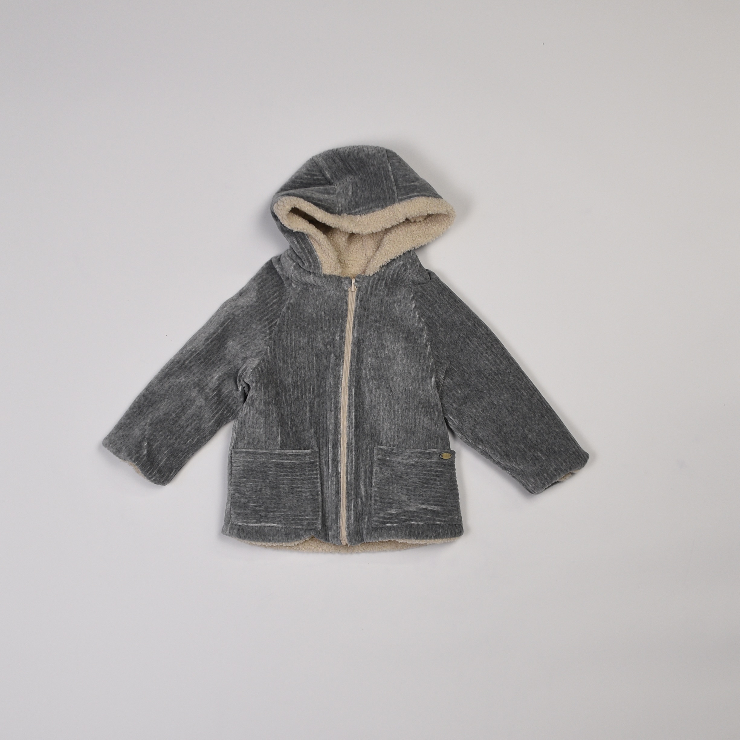 Una giacca doubleface che unisce praticità e dolcezza. Da un lato velluto grigio a costine con interno in morbida pelliccia effetto teddy, dall’altro lato rivestimento beige teddy con cappuccio arricchito da simpatiche orecchiette. Dotata di tasche applicate e chiusura con zip frontale, permette di avere due stili in un solo capo: uno più elegante e sobrio, l’altro caldo e giocoso.