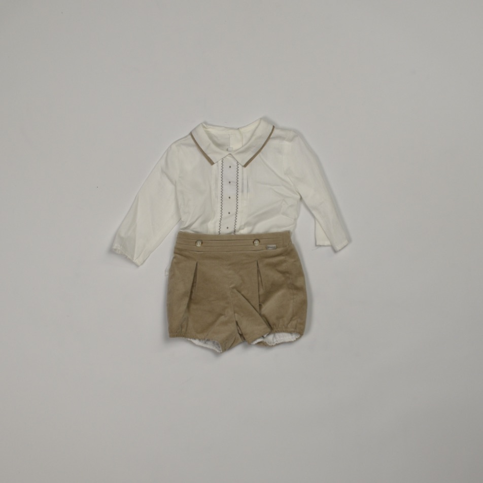 Completo Mayoral da neonato composto da camicia bianca con colletto e bordi a contrasto beige, impreziosita da delicati dettagli ricamati sul davanti, abbinata a shorts in velluto liscio color nocciola con bottoni decorativi e pieghe frontali.