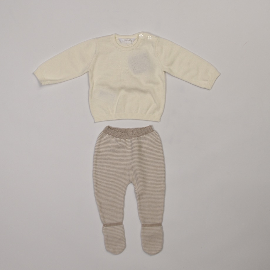 Completo Mayoral da neonato composto da maglioncino a maniche lunghe con chiusura a bottoncini sulla spalla e pantalone con piedini coordinato.