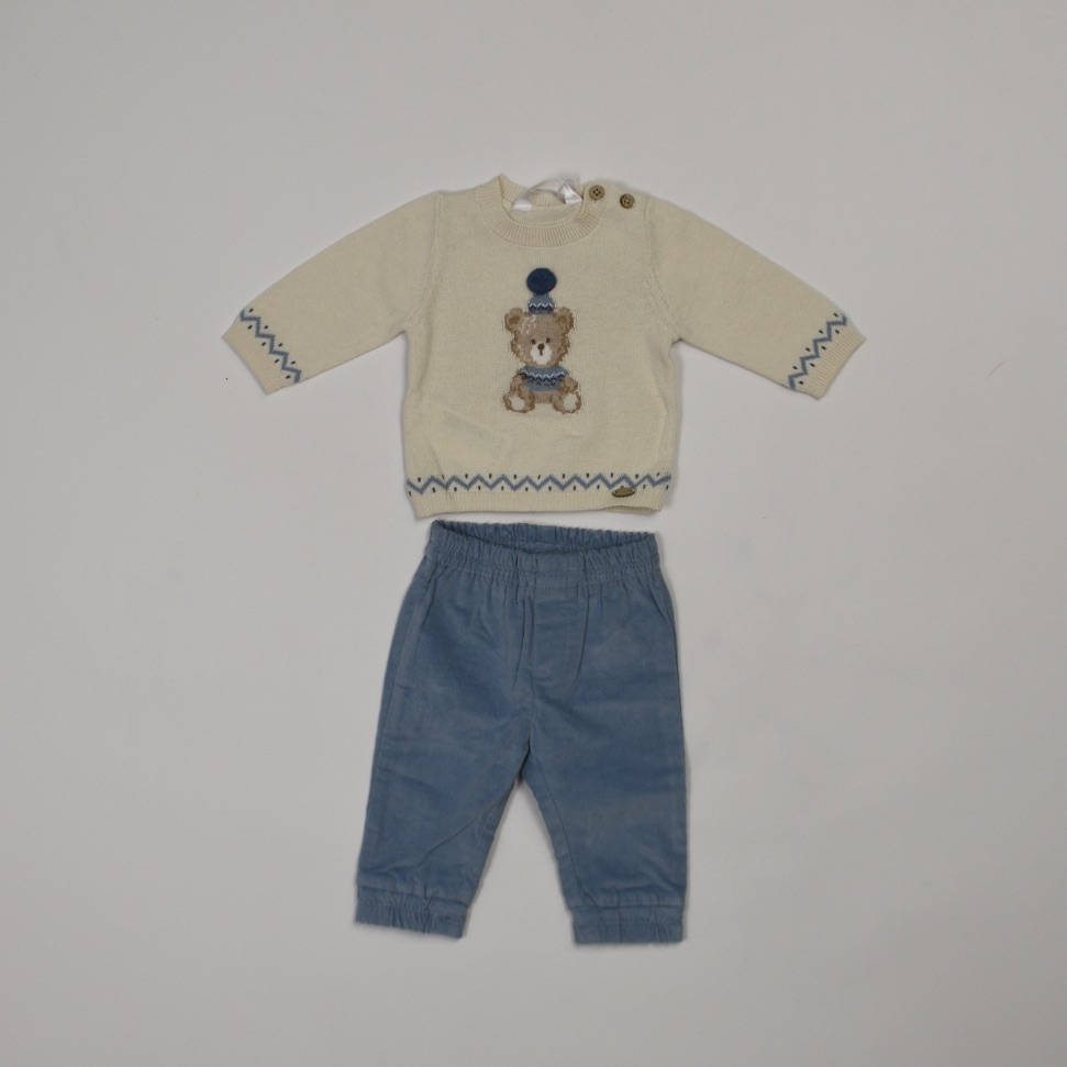 Delizioso completo Mayoral composto da maglia in tricot color panna con ricamo orsetto e pompon applicato, abbinata a pantaloni in velluto millerighe color azzurro polvere.