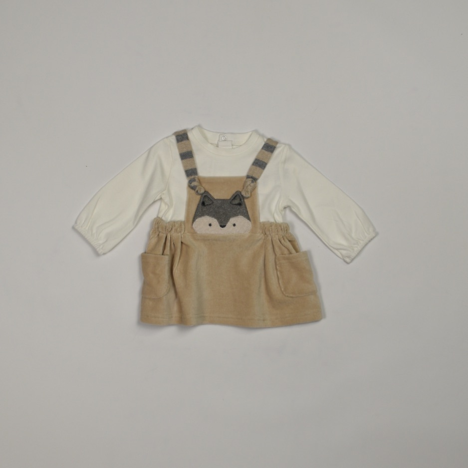 La parte superiore presenta un ricamo con volpe stilizzata sul davanti e bretelle a righe grigio/beige, mentre la gonna è dotata di tasche laterali applicate e vita elasticizzata per una vestibilità confortevole.