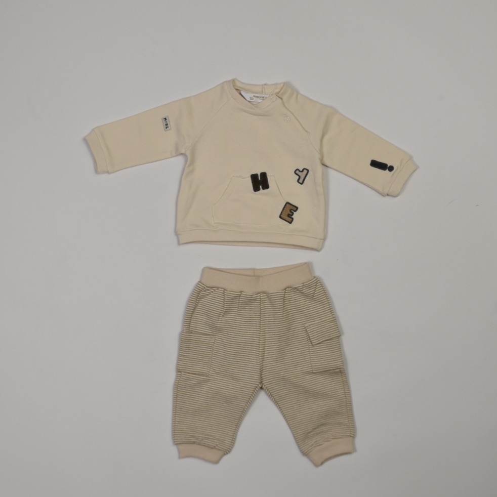 Completo Mayoral in morbido cotone, composto da felpa color panna con applicazioni di lettere e tasca frontale a marsupio, abbinata a pantaloni beige a righe sottili.