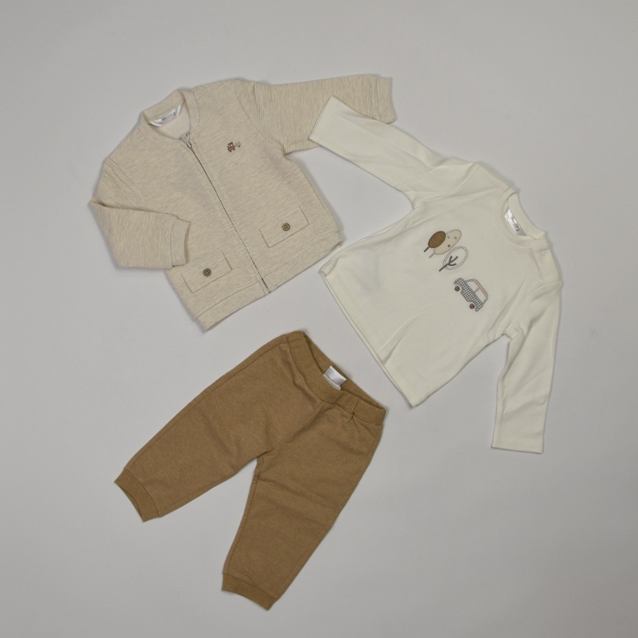 Completo Mayoral in morbido cotone, composto da giacchina beige mélange con zip e taschine frontali, maglia pannacon stampa orsetto e macchinina, e pantaloni caramello con vita elasticizzata.