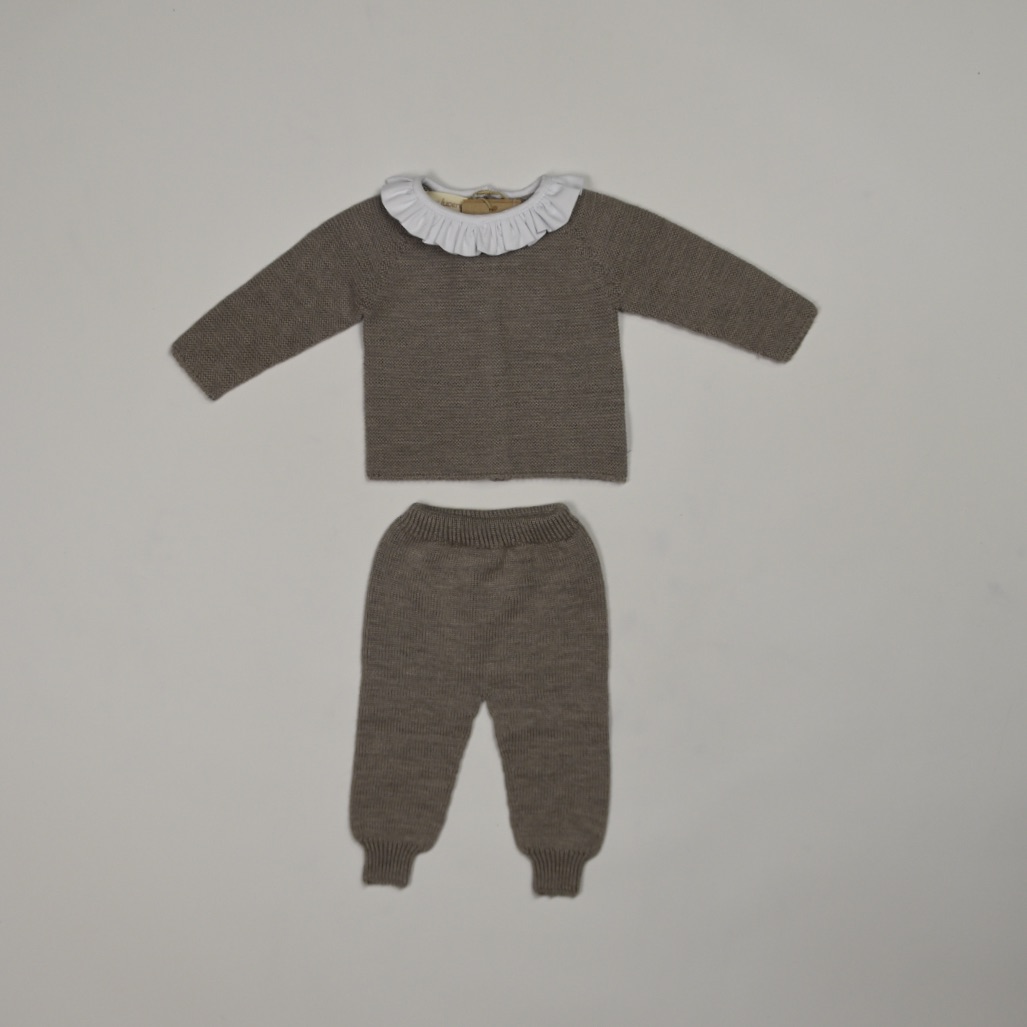 Coordinato Mi Lucero in maglia color tortora, composto da maglioncino a maniche lunghe con elegante colletto bianco arricciato e pantalone abbinato con fascia elastica in vita. Realizzato in filato morbido e confortevole, pensato per garantire calore e libertà di movimento. Rifinito con dettagli curati e bordi a costine.