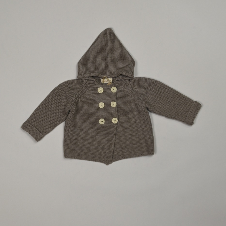 Cappottino Mi Lucero in maglia rasata color tortora, con cappuccio e chiusura doppiopetto a sei bottoni color panna. Linea morbida e confortevole, rifinita con polsini arrotolati e taglio leggermente svasato. Realizzato in filato caldo e soffice, perfetto per la stagione autunnale e invernale.