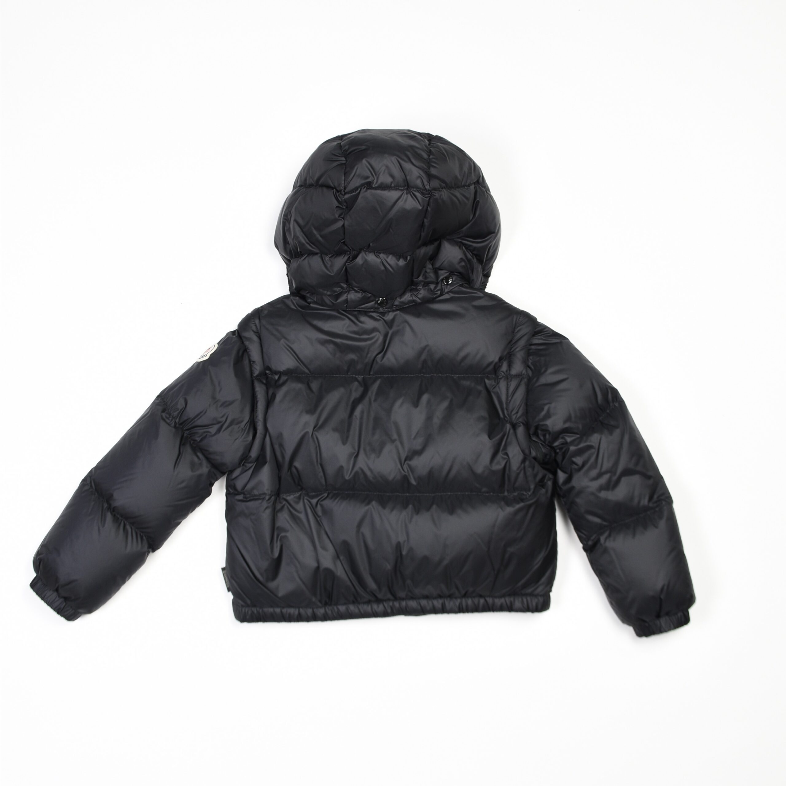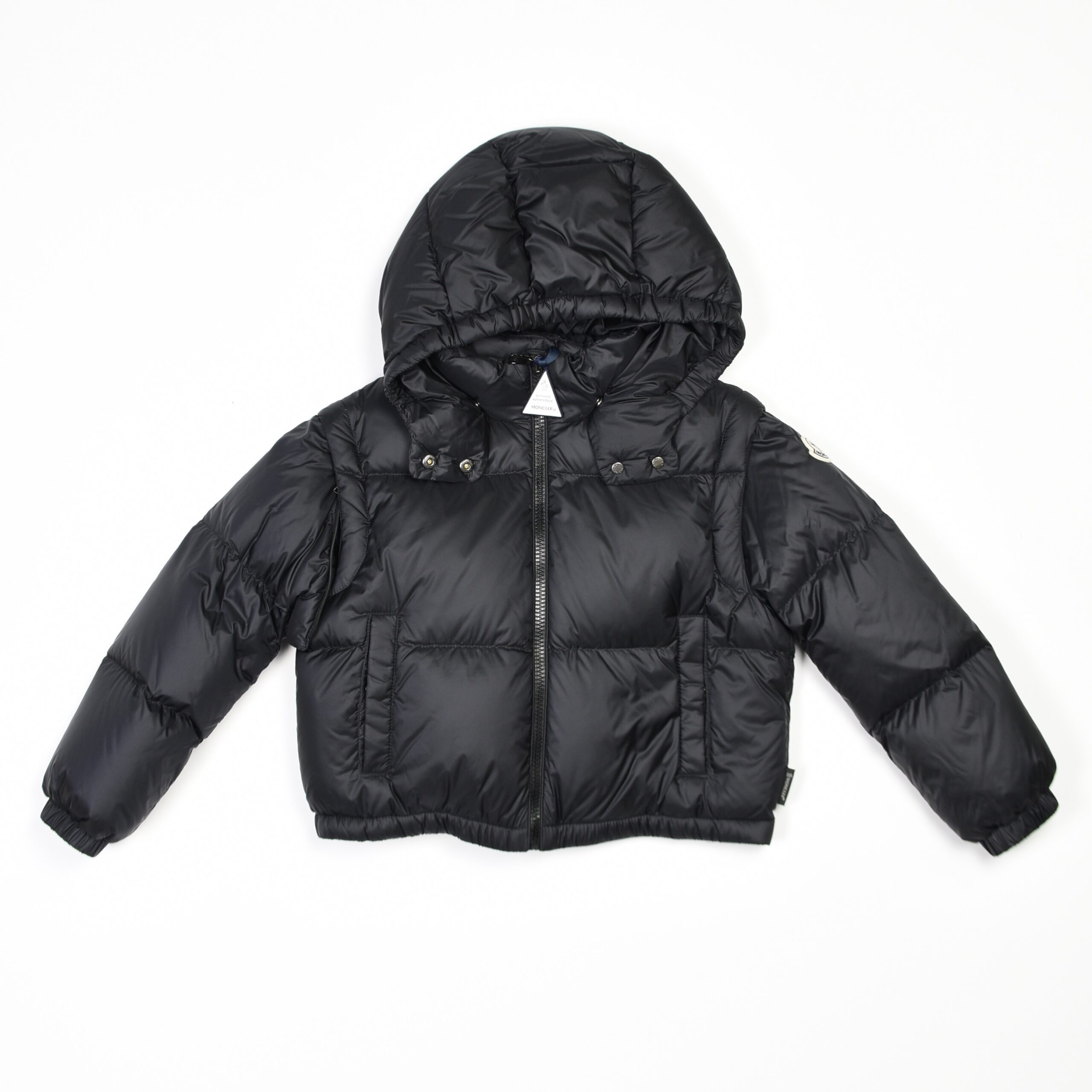 Piumino corto nero con imbottitura calda e leggera, ideale per la stagione invernale. Modello con cappuccio, chiusura con zip frontale e tasche laterali. Polsini e fondo con elastico per garantire comfort e protezione dal freddo. Logo Moncler applicato sulla manica.