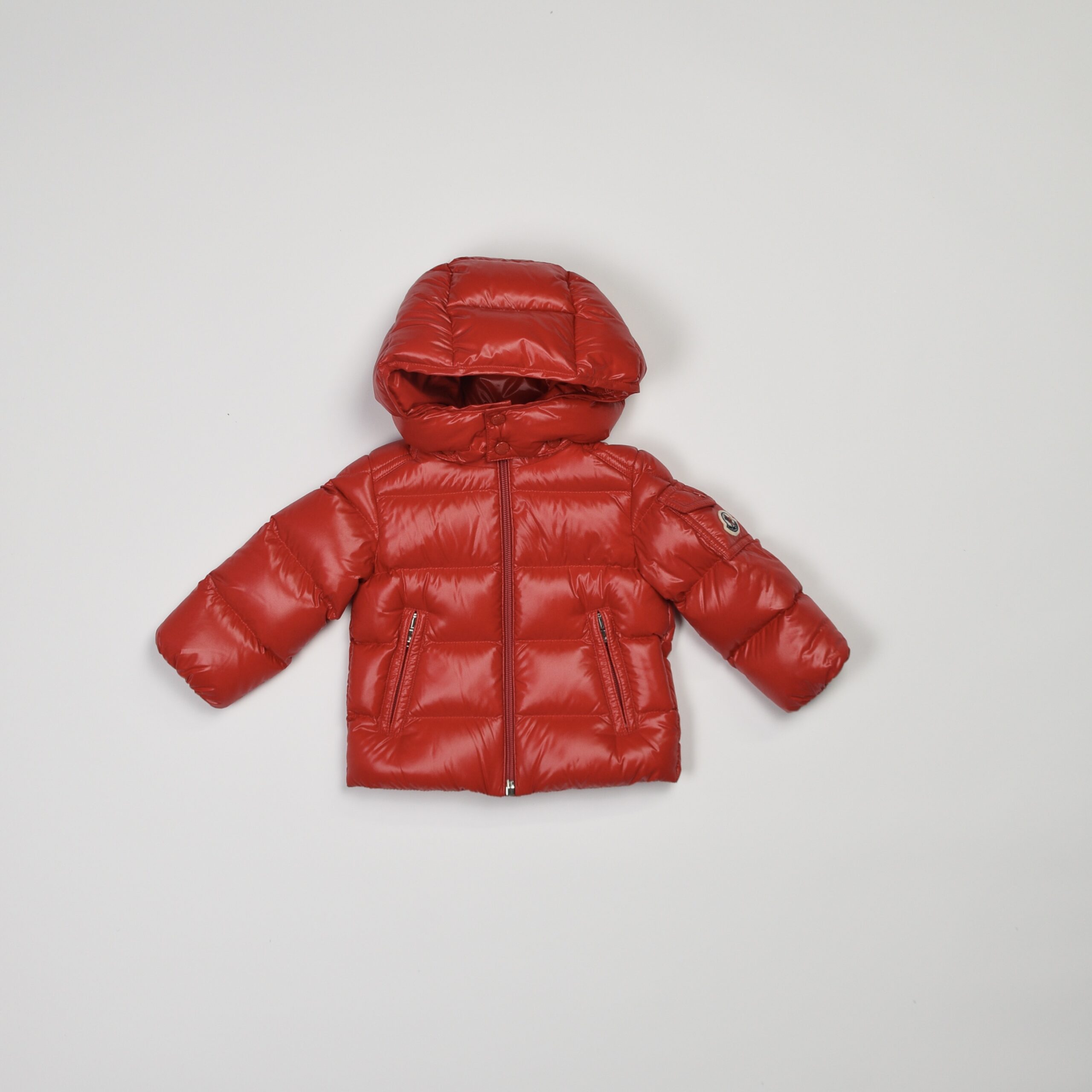 Giubbino imbottito in colore rosso lucido, con cappuccio fisso e chiusura a zip frontale. Tasche laterali con zip e stemma Moncler applicato sulla manica sinistra. Linea classica e confortevole.