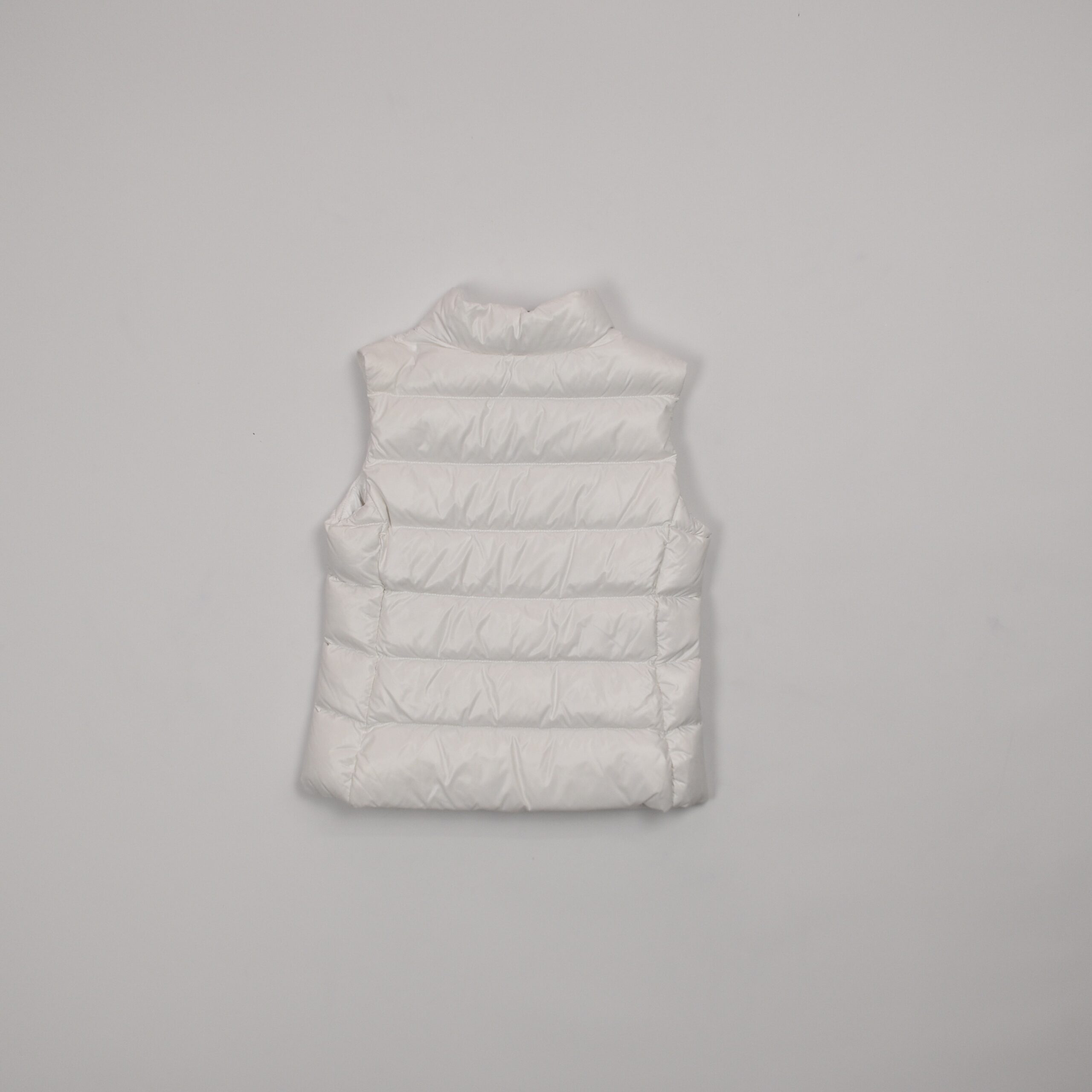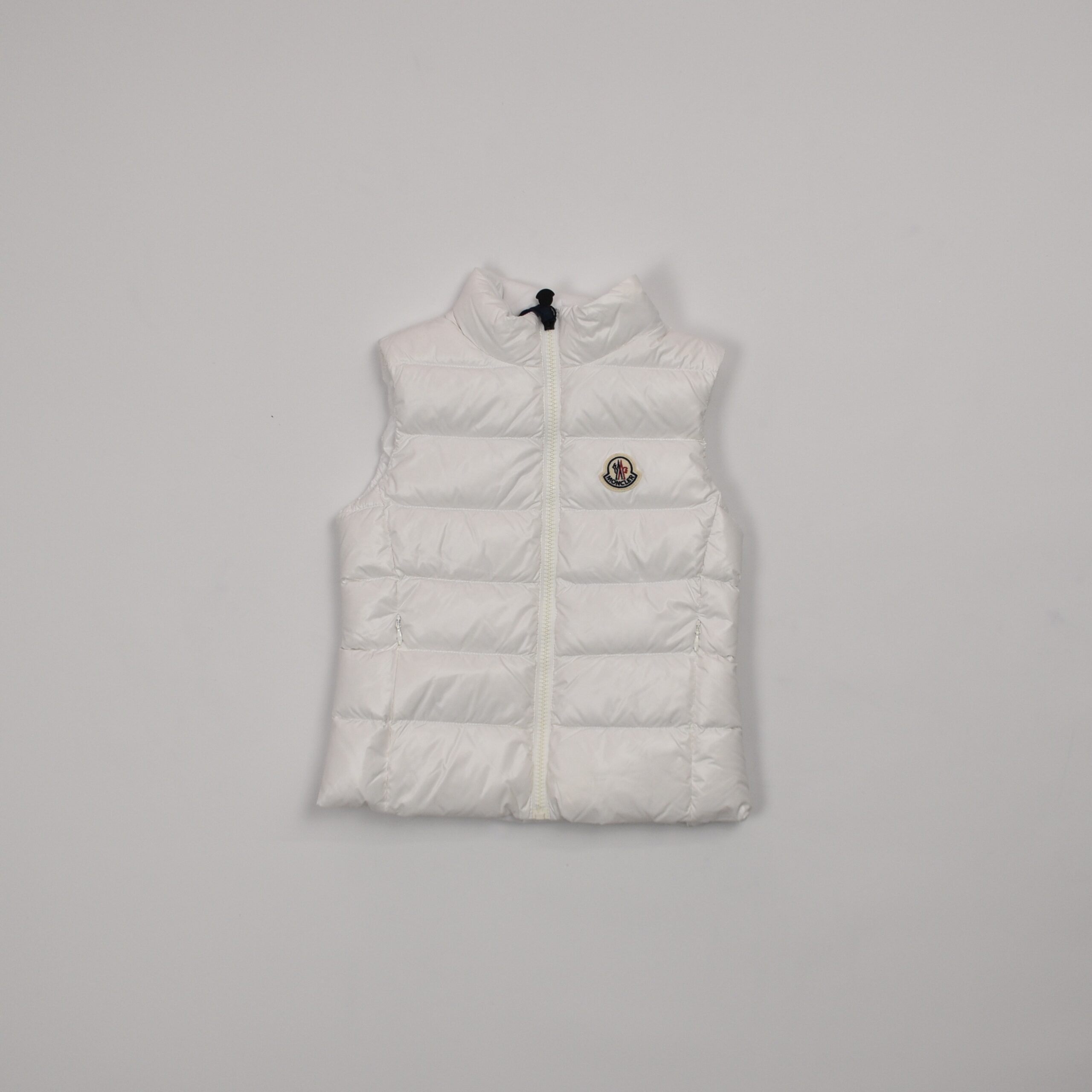 Gilet Moncler in colore panna con trapuntatura orizzontale e imbottitura leggera. Il modello presenta collo alto, chiusura con zip frontale e tasche laterali con zip a scomparsa. Il dettaglio iconico è il logo patch applicato sul petto, che completa il design essenziale e raffinato.