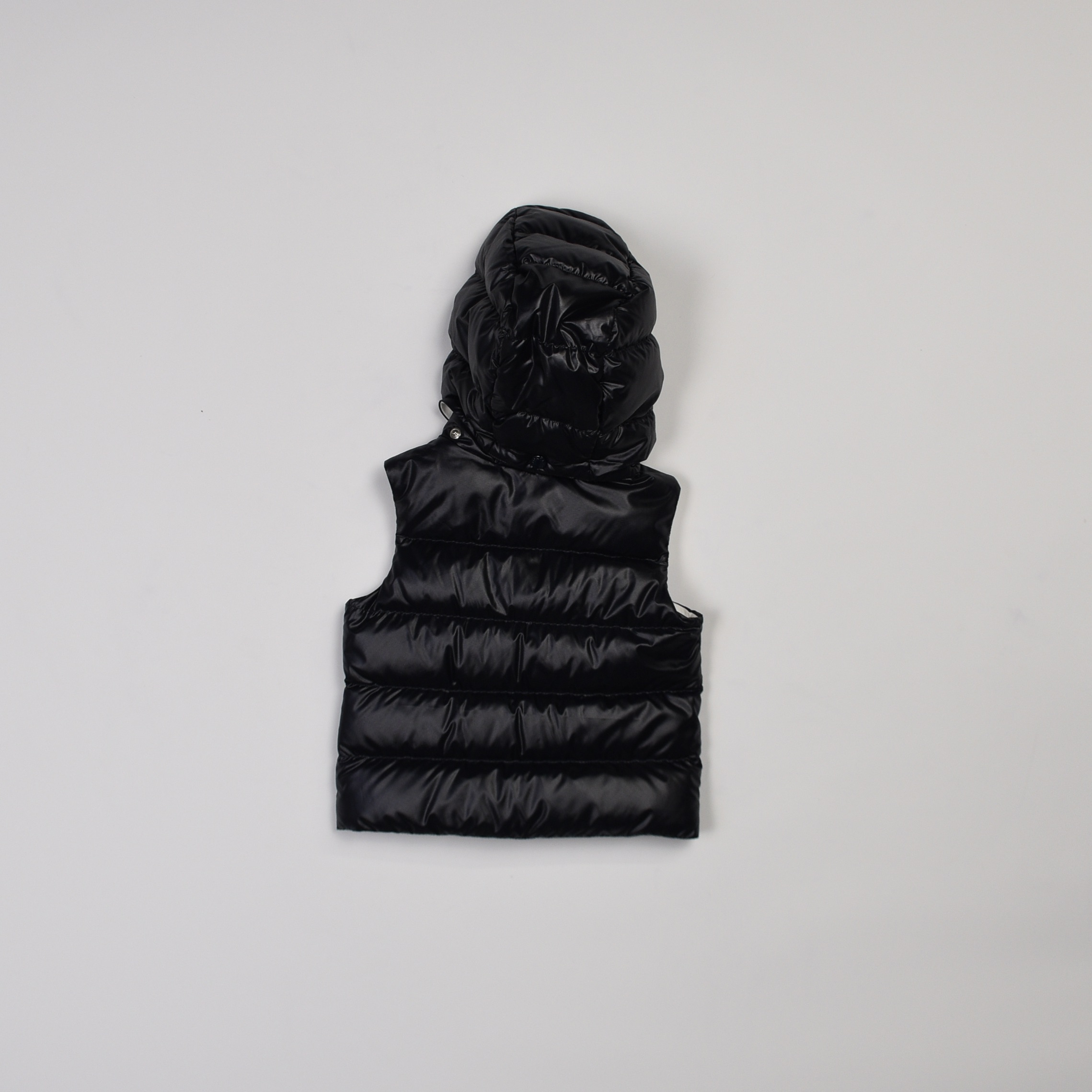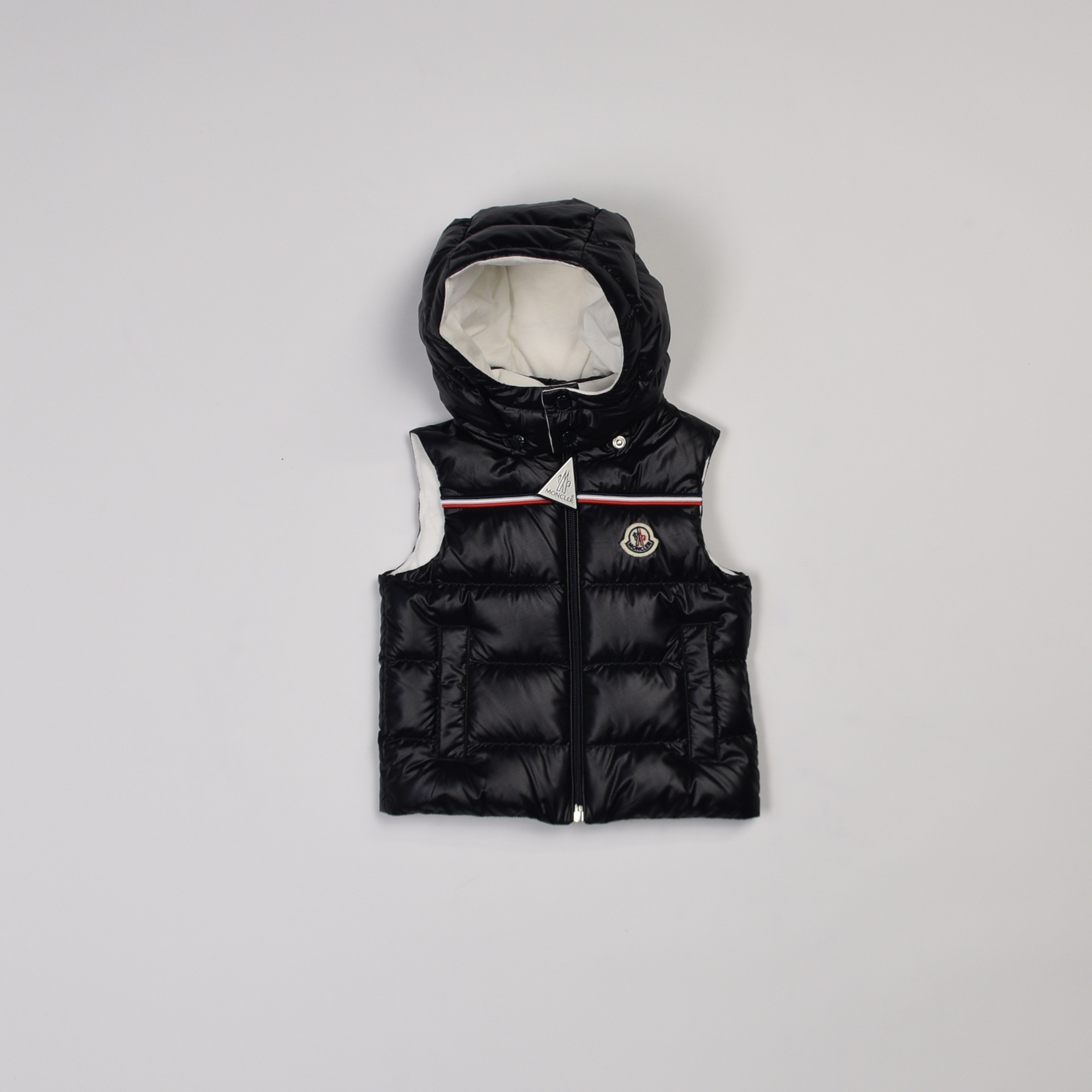 Gilet imbottito Moncler in nylon nero lucido con interno a contrasto bianco. Il modello presenta trapuntatura orizzontale, cappuccio fisso con coulisse, chiusura frontale con zip e tasche laterali. È arricchito da una banda tricolore sul petto e dal patch logo Moncler applicato sul lato sinistro.