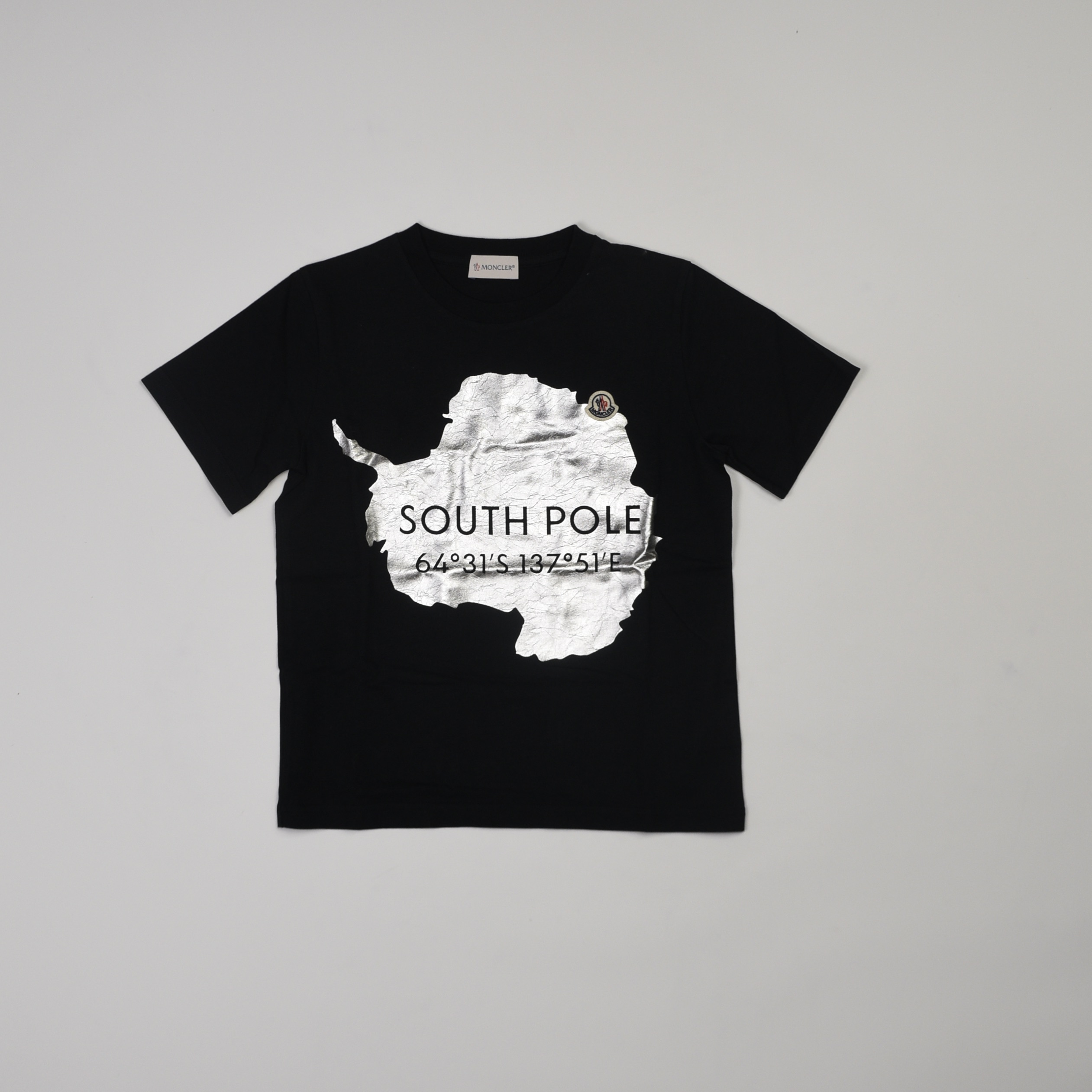 T-shirt a maniche corte in cotone nero, caratterizzata da una maxi stampa argentata che raffigura l’Antartide con la scritta South Pole e le coordinate geografiche. Completata dal logo Moncler applicato sul petto.