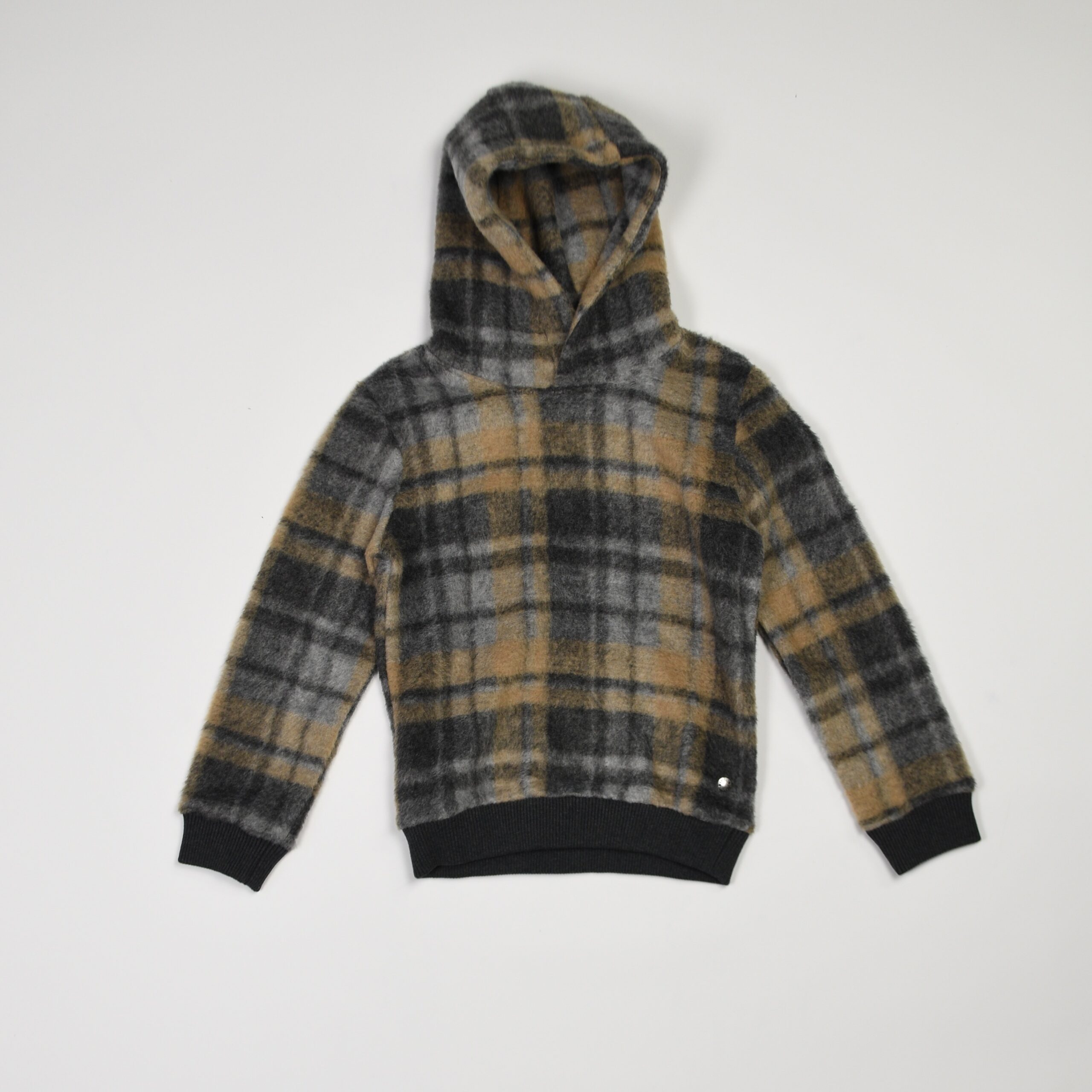 Felpa con cappuccio in tessuto morbido e caldo, caratterizzata da fantasia a quadri nei toni del grigio e cammello. Polsini e fondo in maglia nera a costine per un migliore comfort e vestibilità. Un capo casual ma ricercato, ideale per dare un tocco originale ai look invernali.