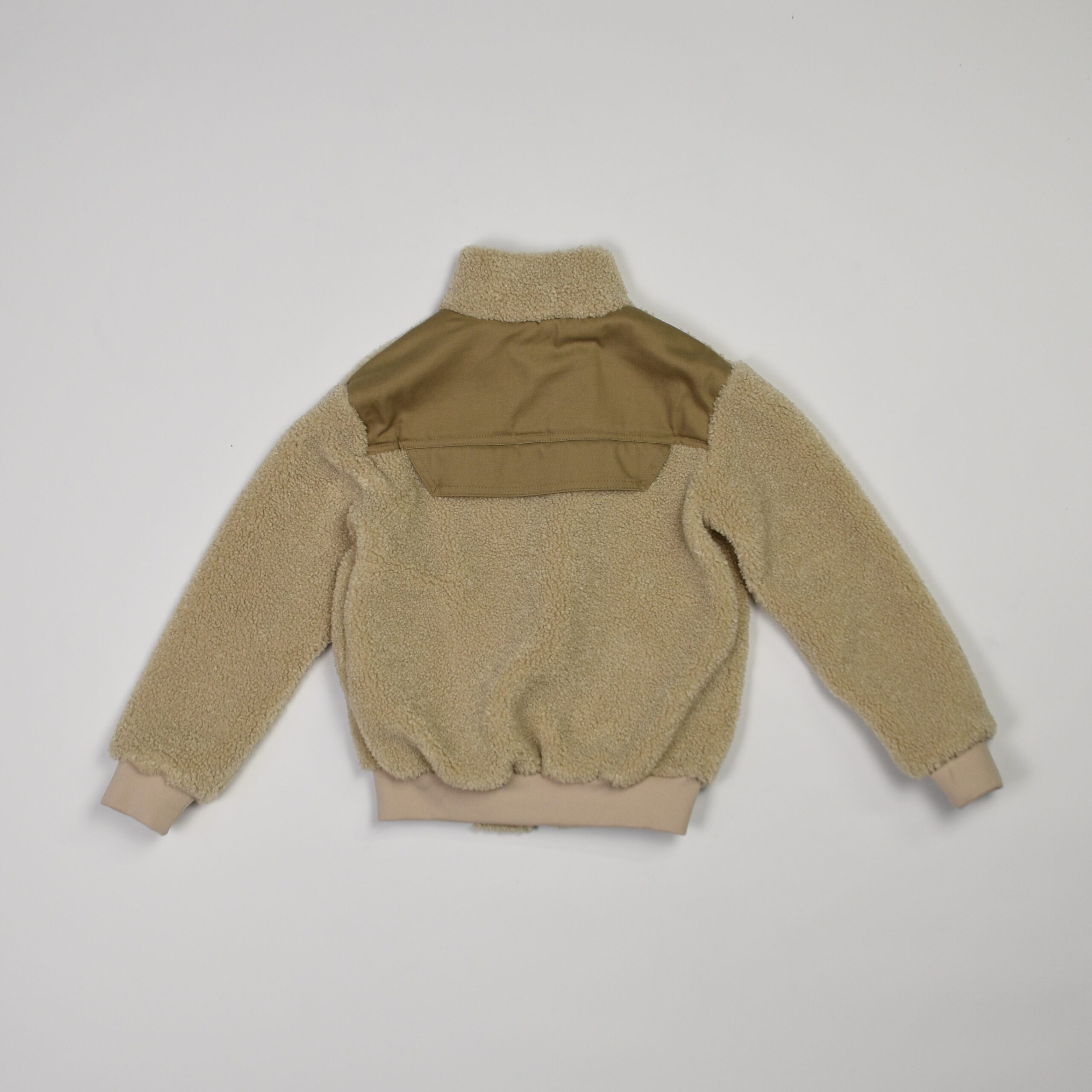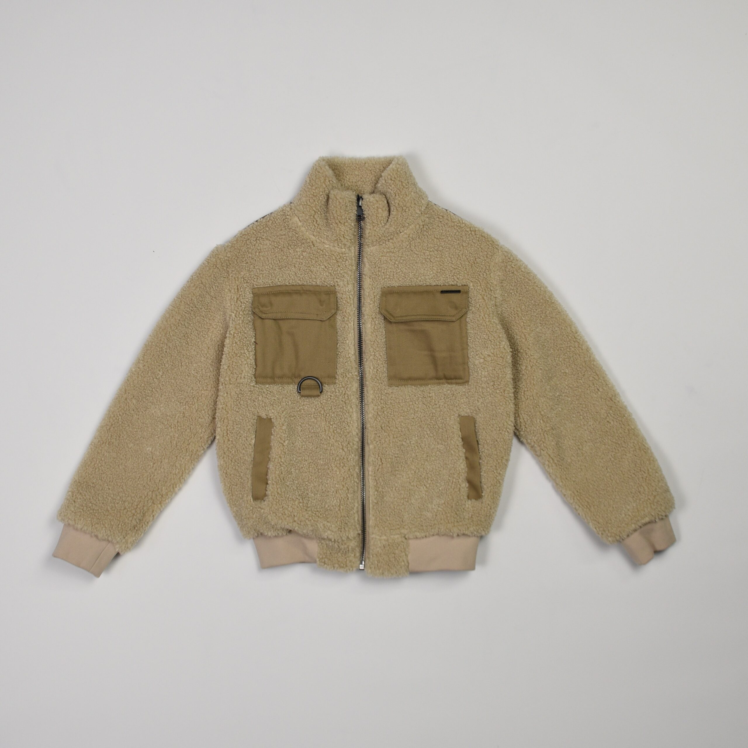Giacca in tessuto effetto teddy color beige, con zip centrale e inserti in tessuto tecnico. Presenta due tasche applicate sul petto con pattina, due tasche laterali e polsini e fondo a costine elasticizzate in tinta. Dettaglio anello metallico decorativo. Vestibilità regolare.