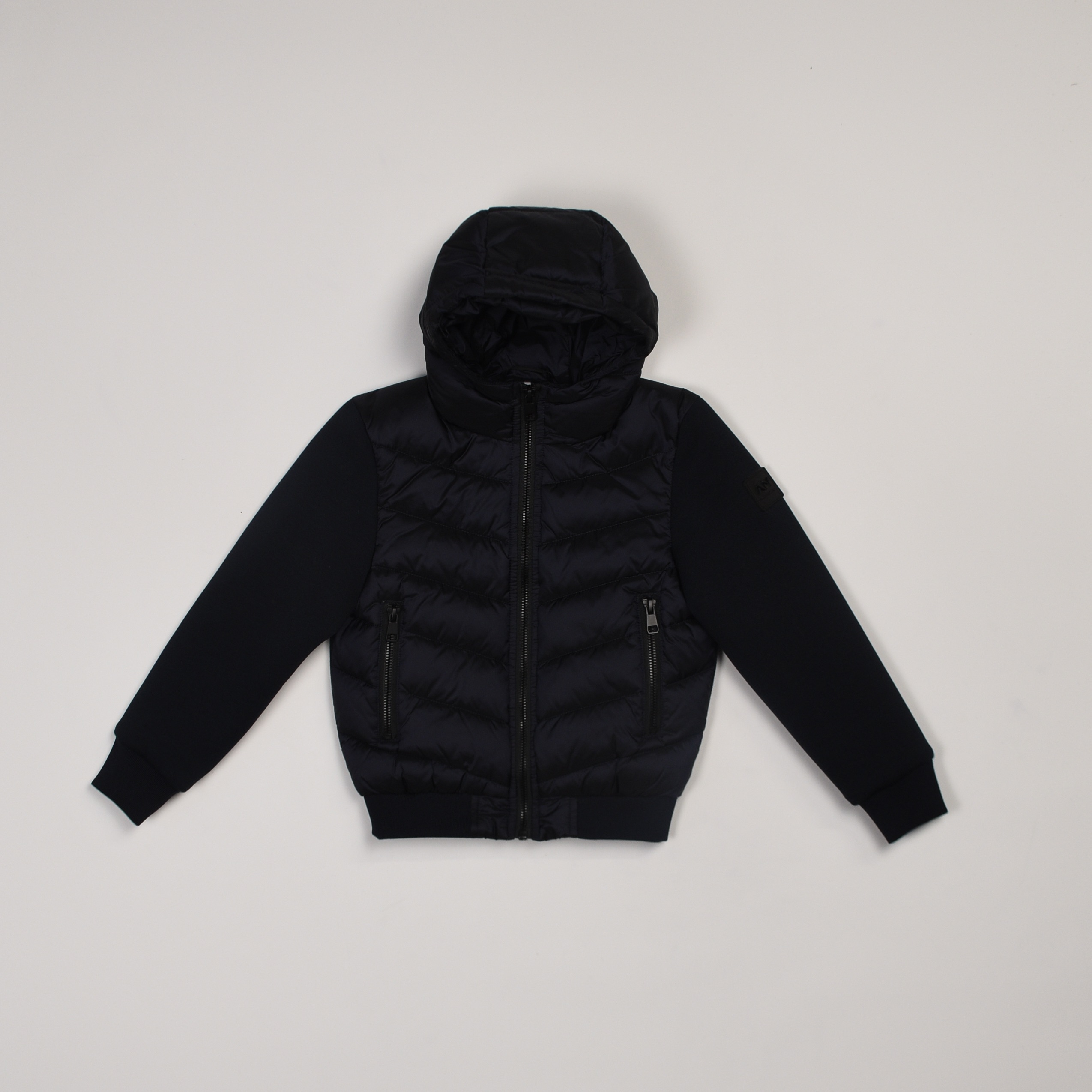 Giubbotto blu navy Antony Morato con cappuccio fisso. Corpo imbottito trapuntato con zip frontale e tasche laterali chiuse da zip. Maniche in tessuto liscio con polsini a costine e patch logo sulla manica sinistra. Fondo a costine per una vestibilità confortevole.