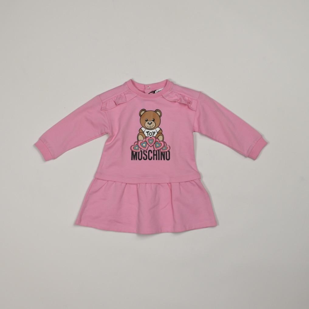 Abito Moschino Baby in cotone rosa con maniche lunghe e gonna svasata.