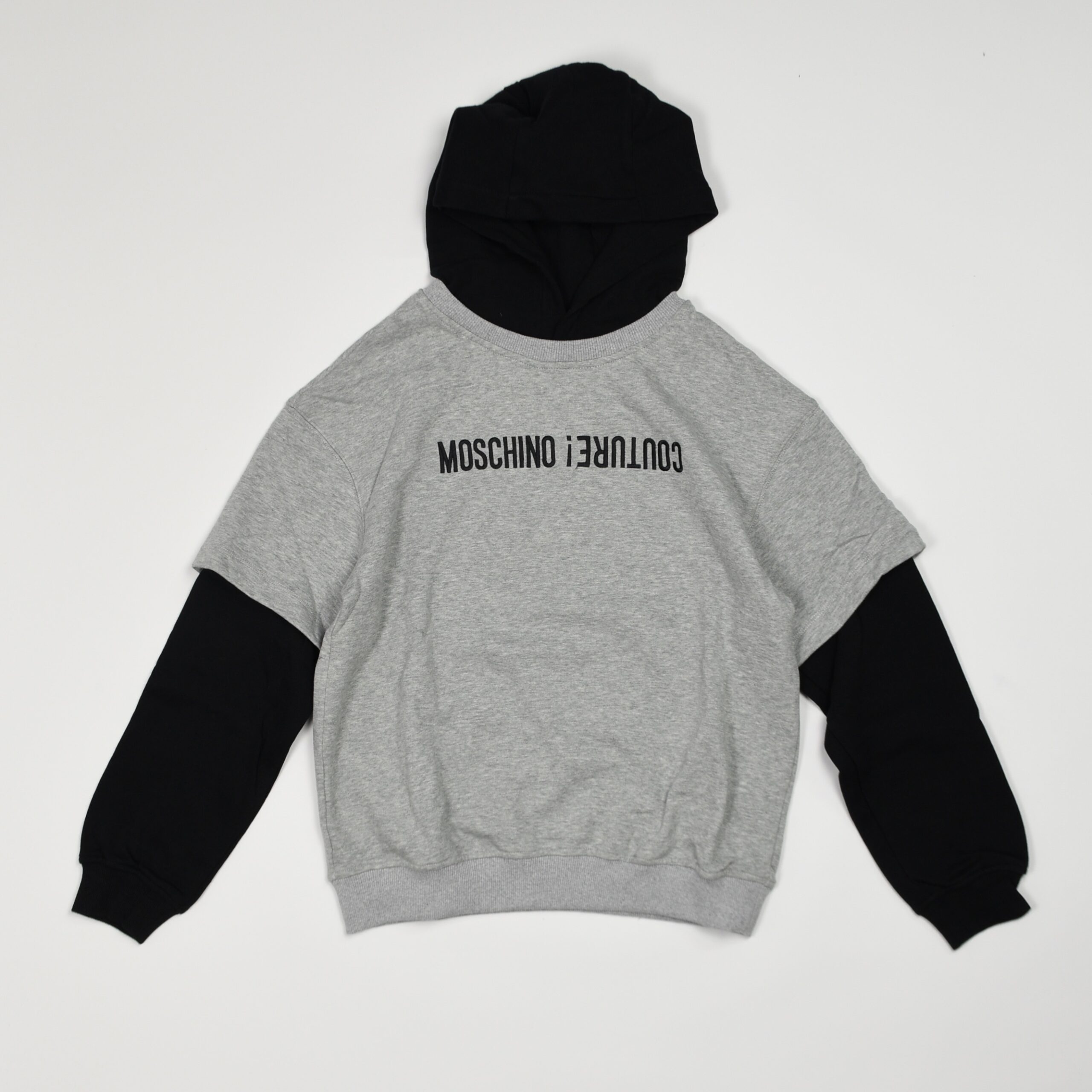 Felpa Moschino Couture in cotone morbido, con design effetto doppio strato: maniche e cappuccio in contrasto nero sotto una t-shirt grigia a maniche corte.