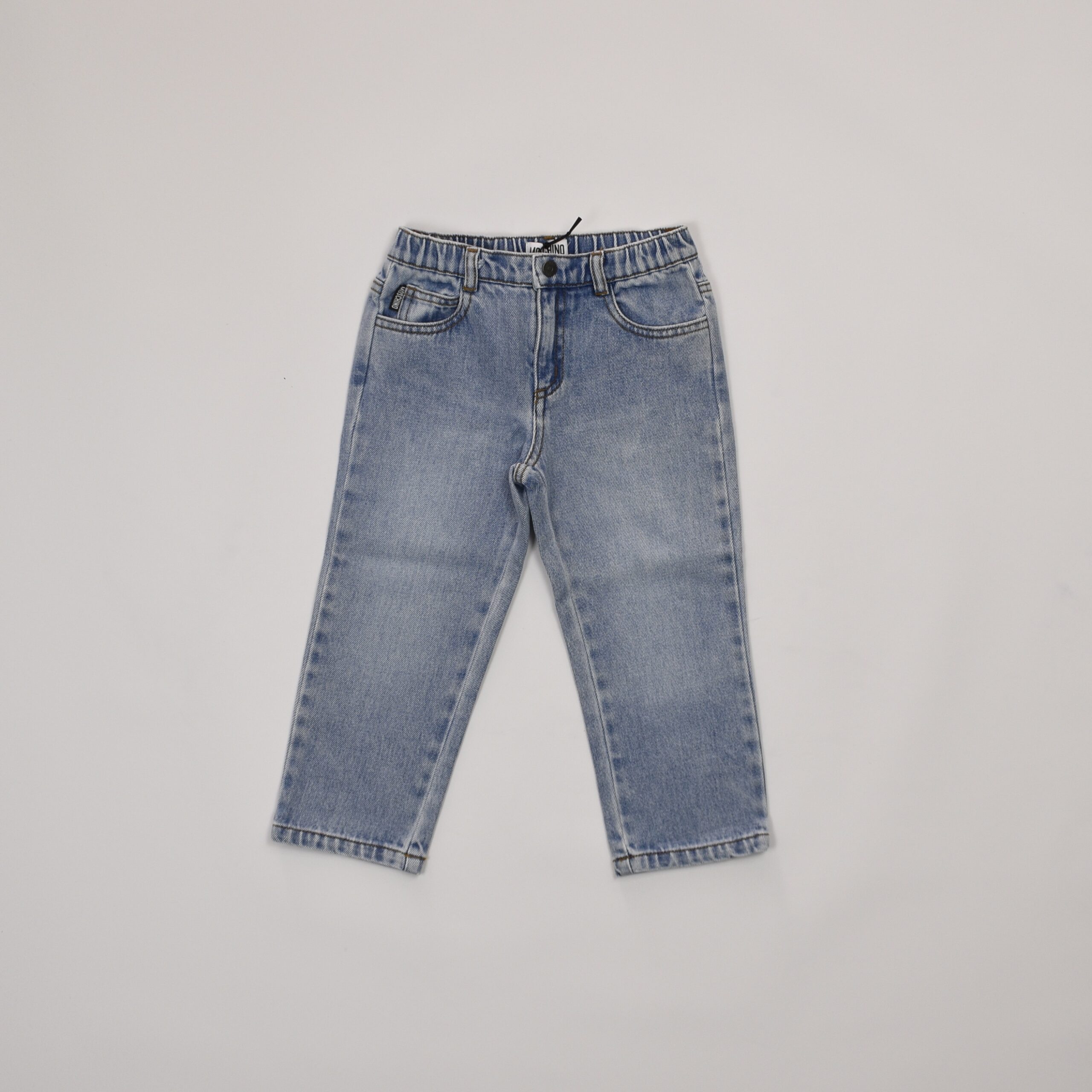 Jeans Moschino da bambino in denim chiaro, morbido e confortevole per l’uso quotidiano. Modello con vita elasticizzata e bottone decorativo, tasche frontali e posteriori e lavaggio chiaro leggermente sfumato. Un capo semplice e versatile, con la qualità distintiva Moschino Baby.