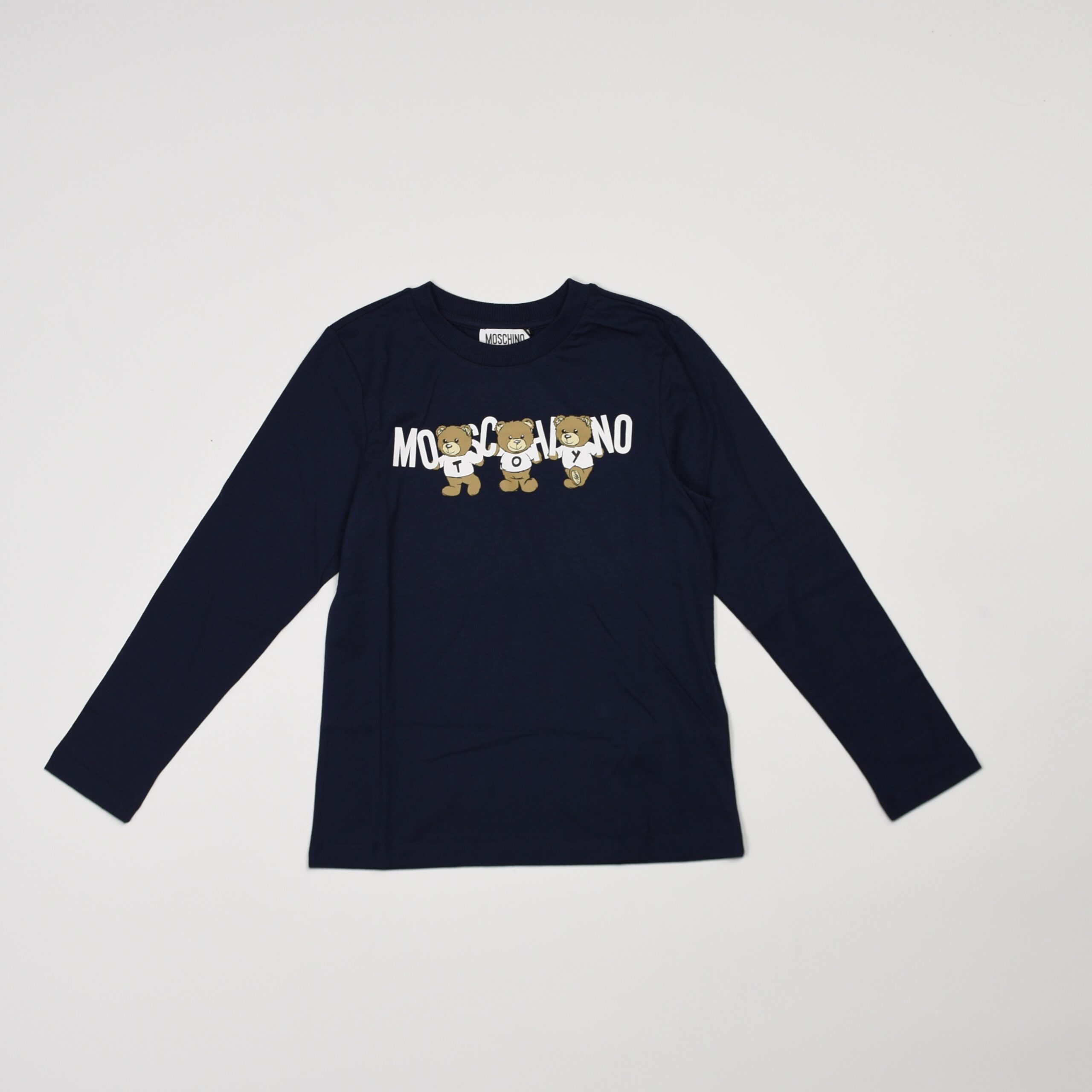 Maglia in cotone blu navy a maniche lunghe, caratterizzata dal logo Moschino stampato sul petto con i classici orsetti iconici del brand che completano la scritta. Girocollo e linea dritta per un look allegro e riconoscibile.