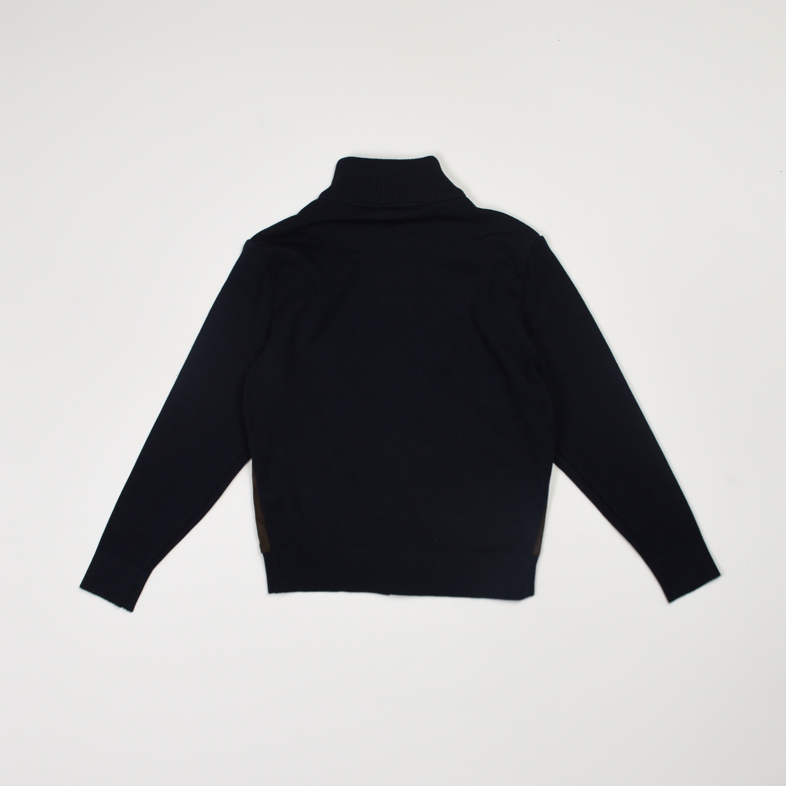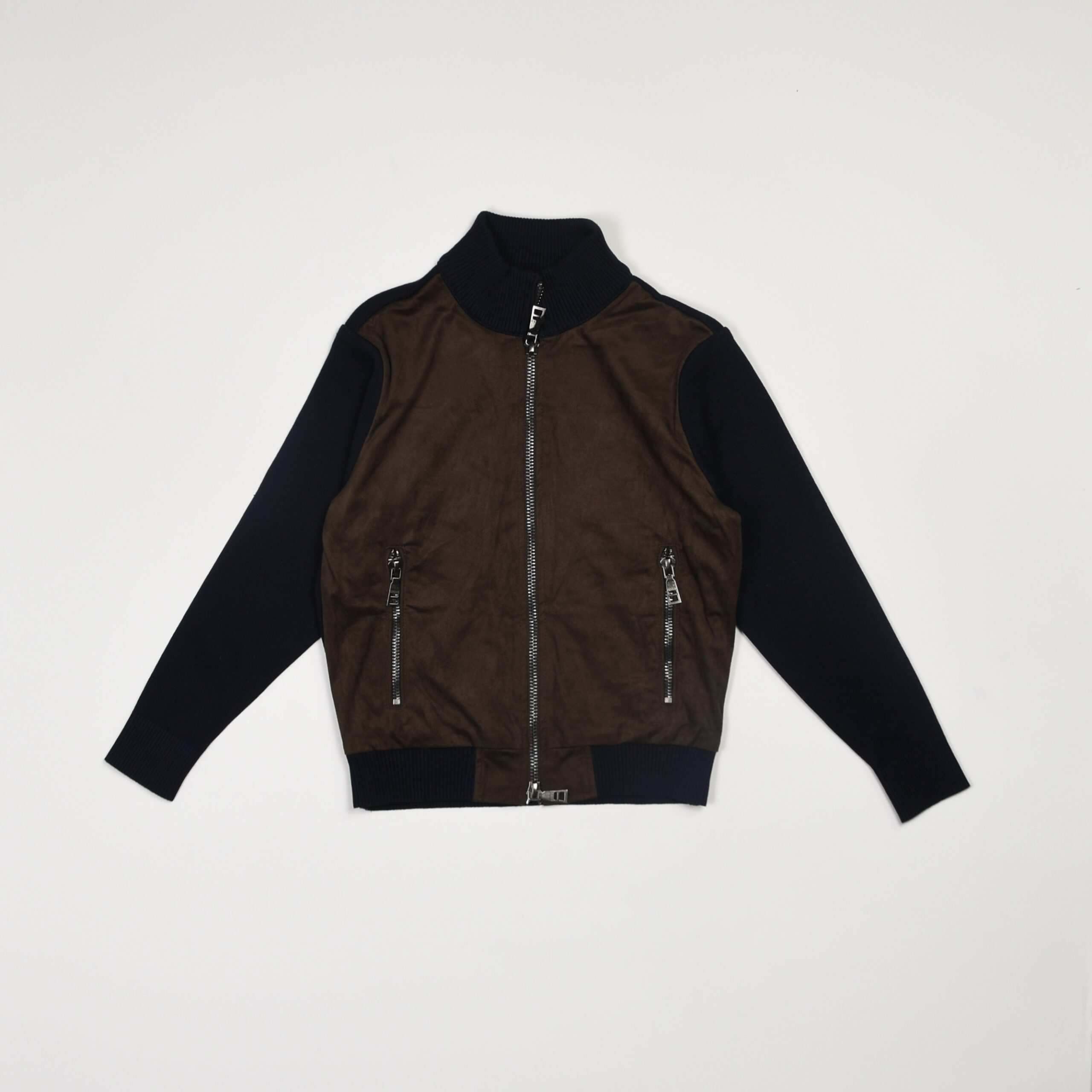Giacca con maniche e retro in maglia nera, davanti in tessuto effetto scamosciato marrone. Modello con zip centrale, collo alto a coste e tasche laterali con zip metalliche. Fondo e polsini in maglia elasticizzata.