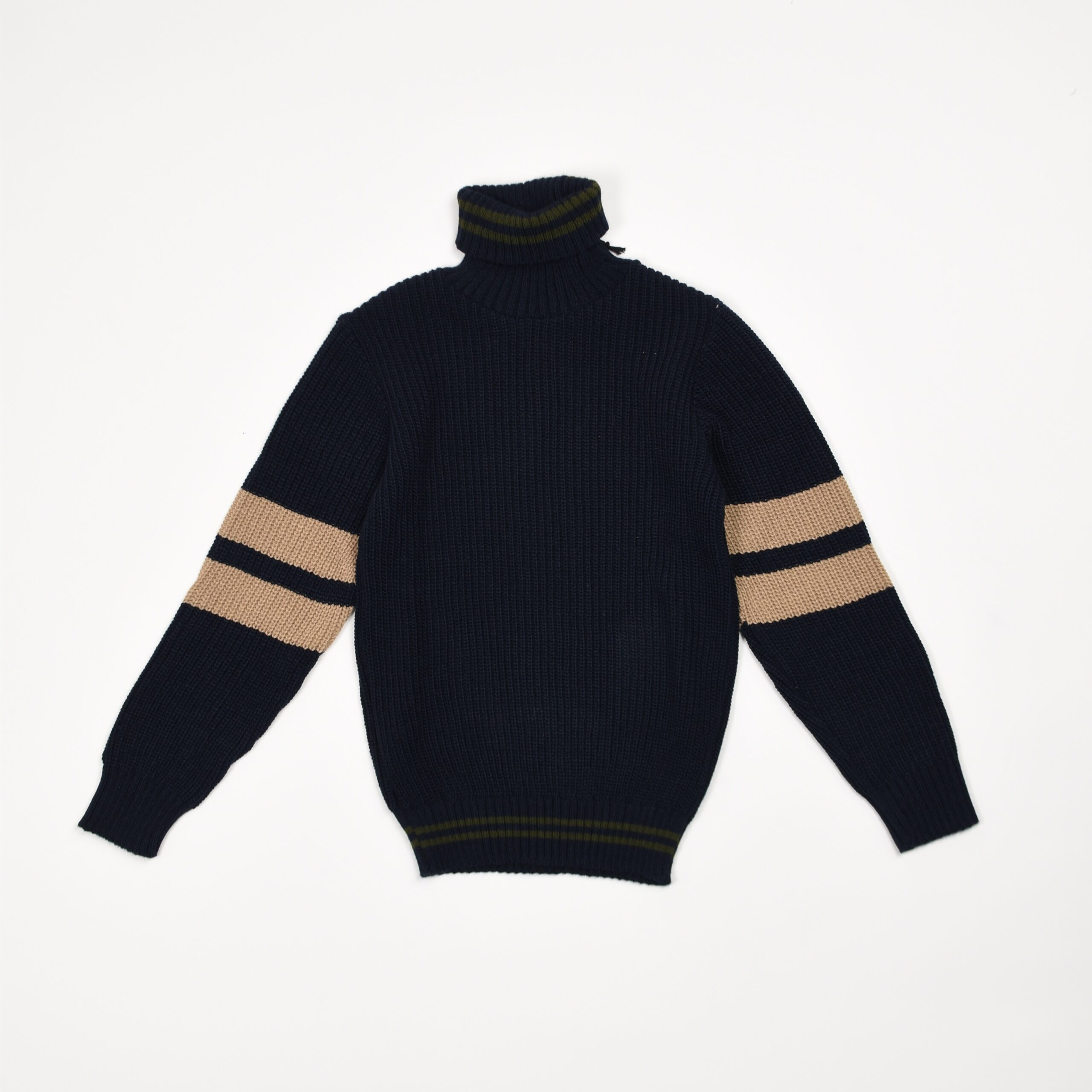 Maglione dolcevita in maglia a coste, colore blu navy. Caratterizzato da fasce orizzontali a contrasto beige e nere sulle maniche e dettagli verde oliva sul collo e sul fondo. Modello a manica lunga con vestibilità regolare e bordi a costine elasticizzate.