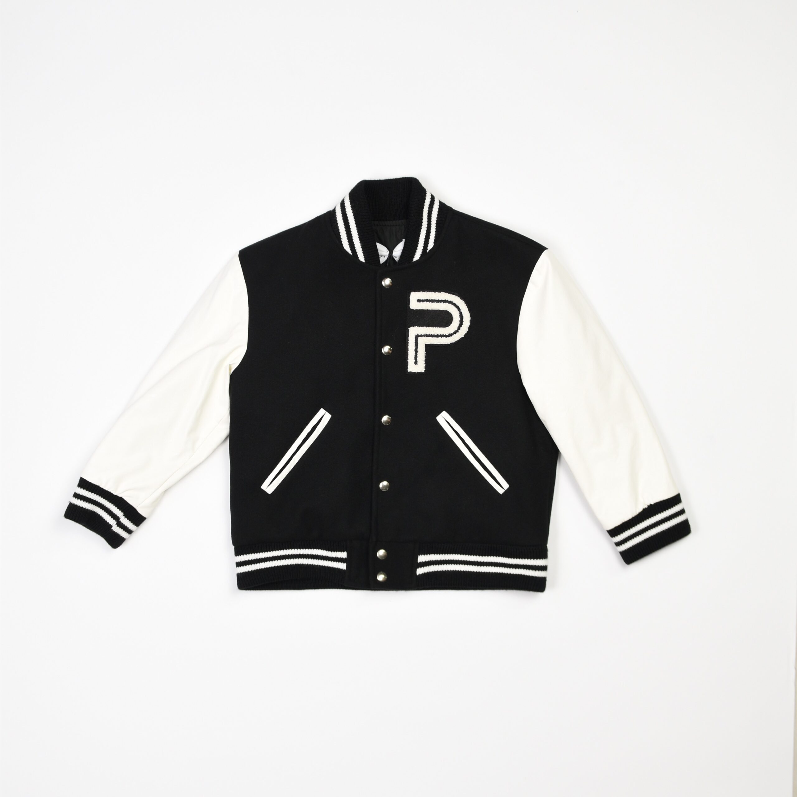 Giubbotto Public ispirato al classico varsity americano, con corpo nero e maniche bianche in contrasto. Logo “P” ricamato sul petto, chiusura con bottoni automatici e dettagli a righe su polsini, colletto e fondo. Un capo iconico e grintoso, perfetto per un look casual e sportivo con un tocco urban.
