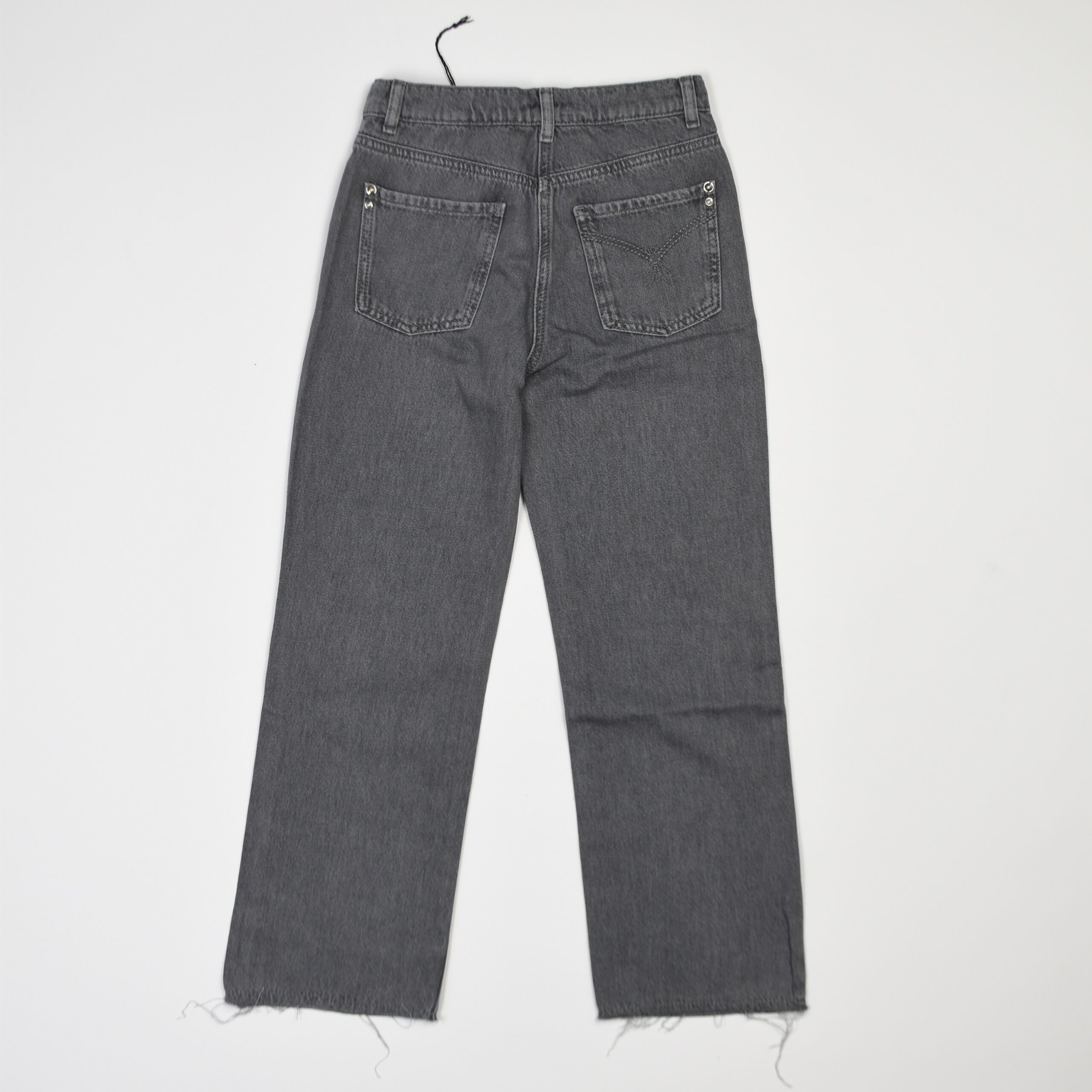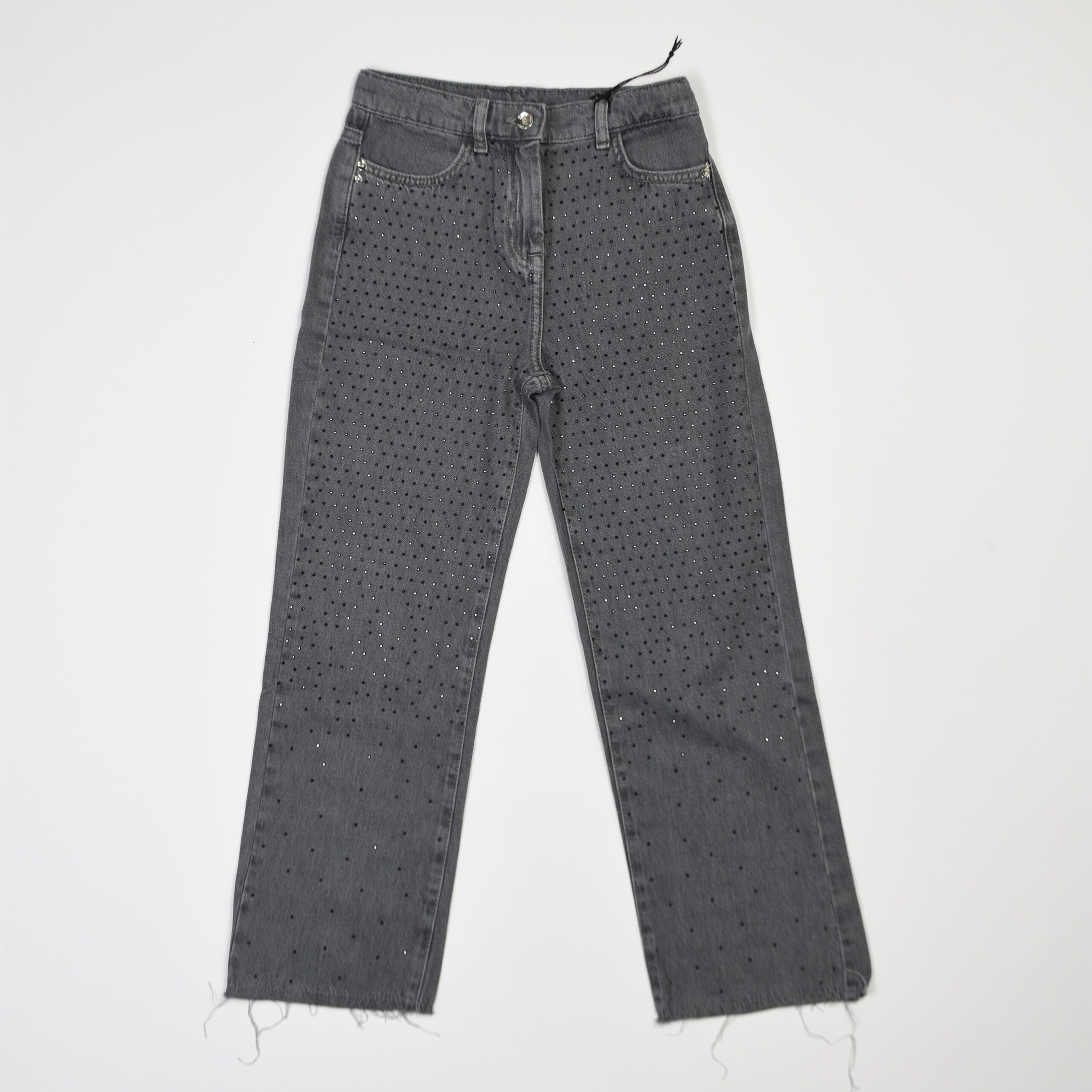 Jeans a gamba dritta in denim grigio con micro strass applicati su tutta la superficie per un effetto luminoso e sofisticato. Modello cinque tasche con vita regolare e fondo sfrangiato che dona un tocco moderno e grintoso. Un capo che unisce l’anima casual del denim al glamour distintivo di Patrizia Pepe.