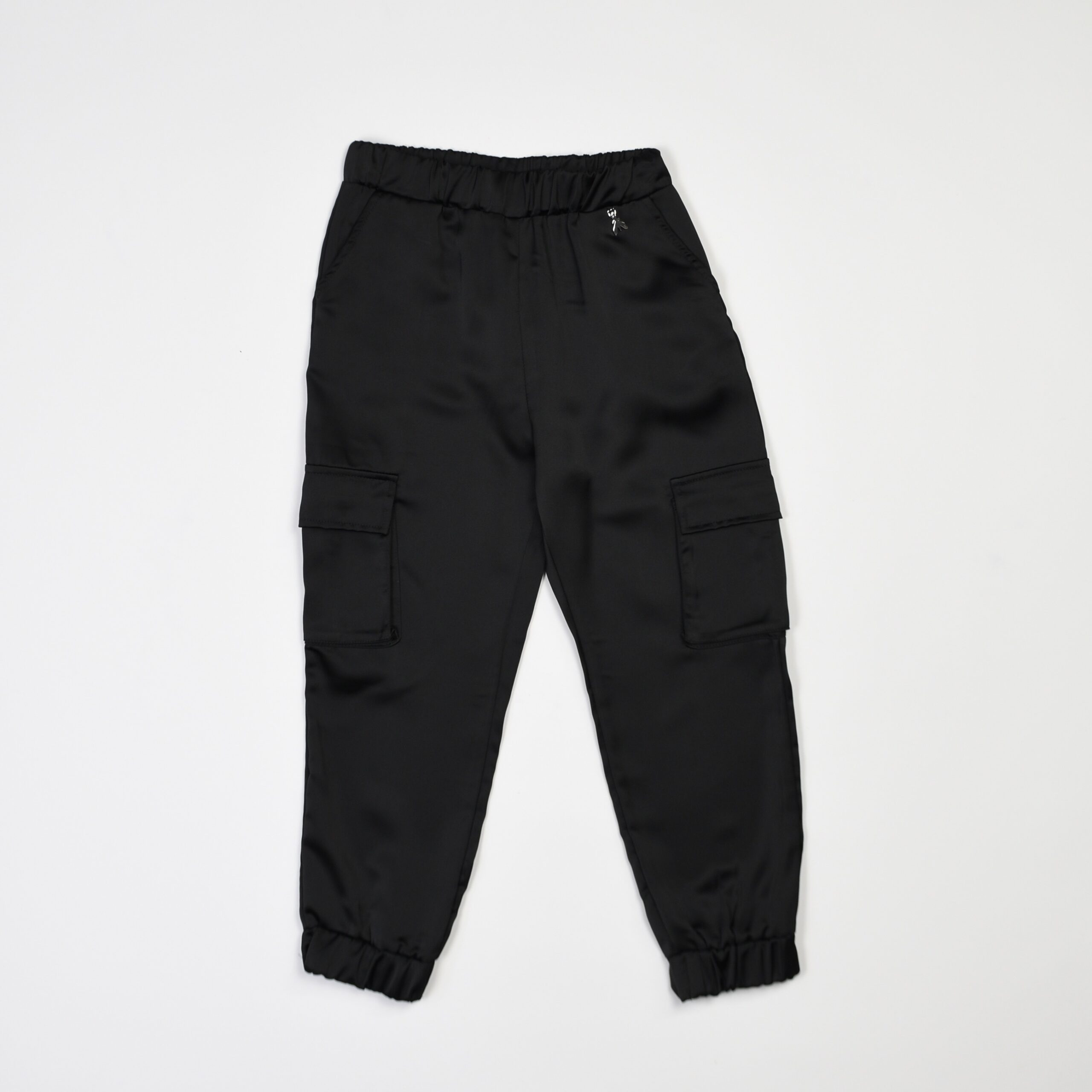 Pantalone nero dallo stile cargo con tasconi laterali, vita elastica e fondo gamba con elastico. Un modello pratico ma ricercato, che unisce comfort e carattere urbano, tipico dello stile Patrizia Pepe.