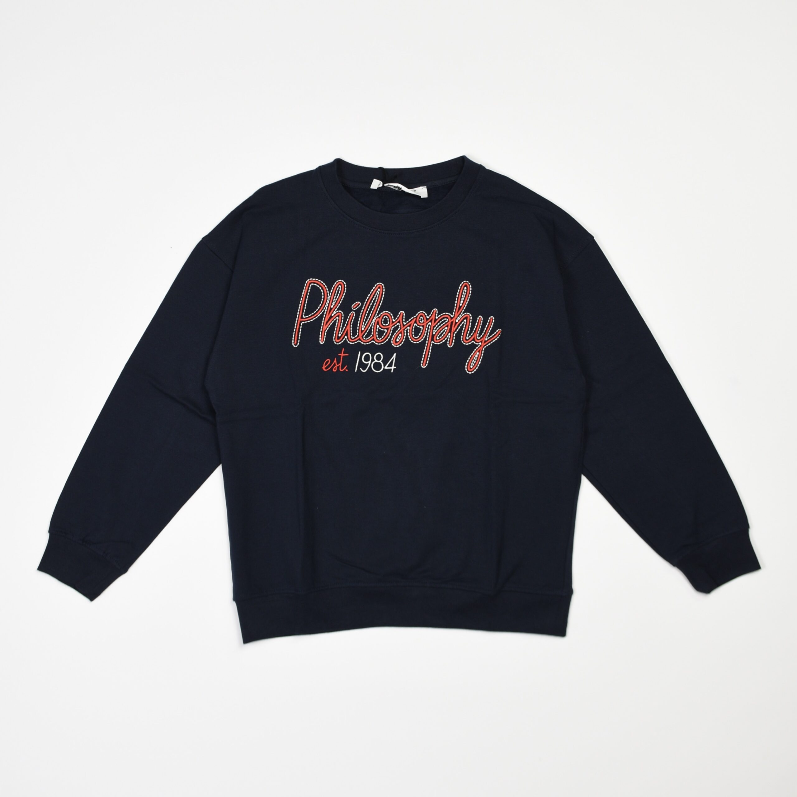 Felpa girocollo in cotone blu navy, impreziosita dal logo Philosophy est. 1984 ricamato sul davanti in rosso e bianco. Un capo casual ma raffinato, perfetto per aggiungere un tocco iconico e riconoscibile ai look di tutti i giorni.