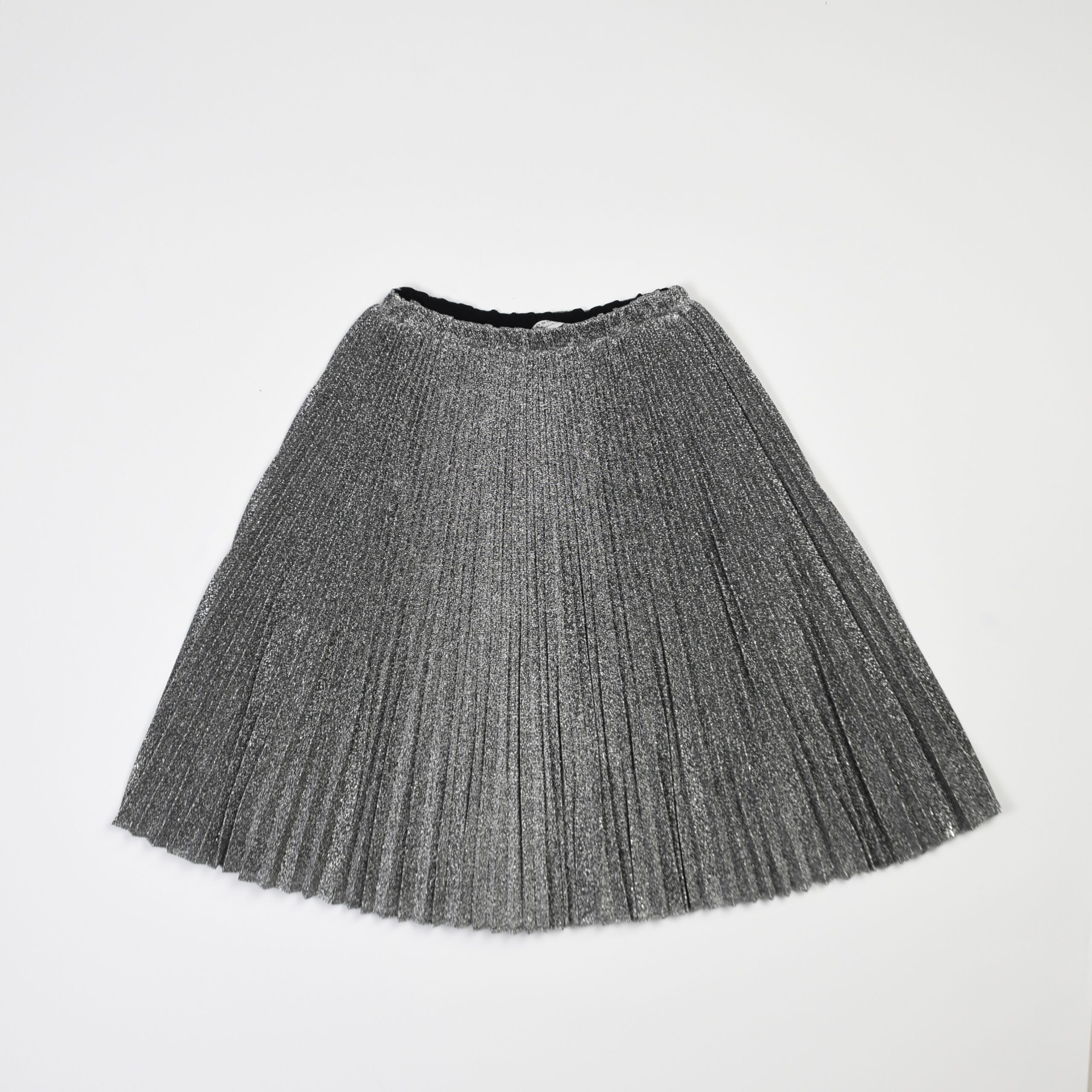 Gonna lunga plissettata da bambina, realizzata in tessuto leggero e luminoso color argento. La lavorazione a pieghe regolari dona movimento ed eleganza al capo, rendendolo perfetto per occasioni speciali e outfit raffinati. Vita elasticizzata per garantire comfort e praticità.