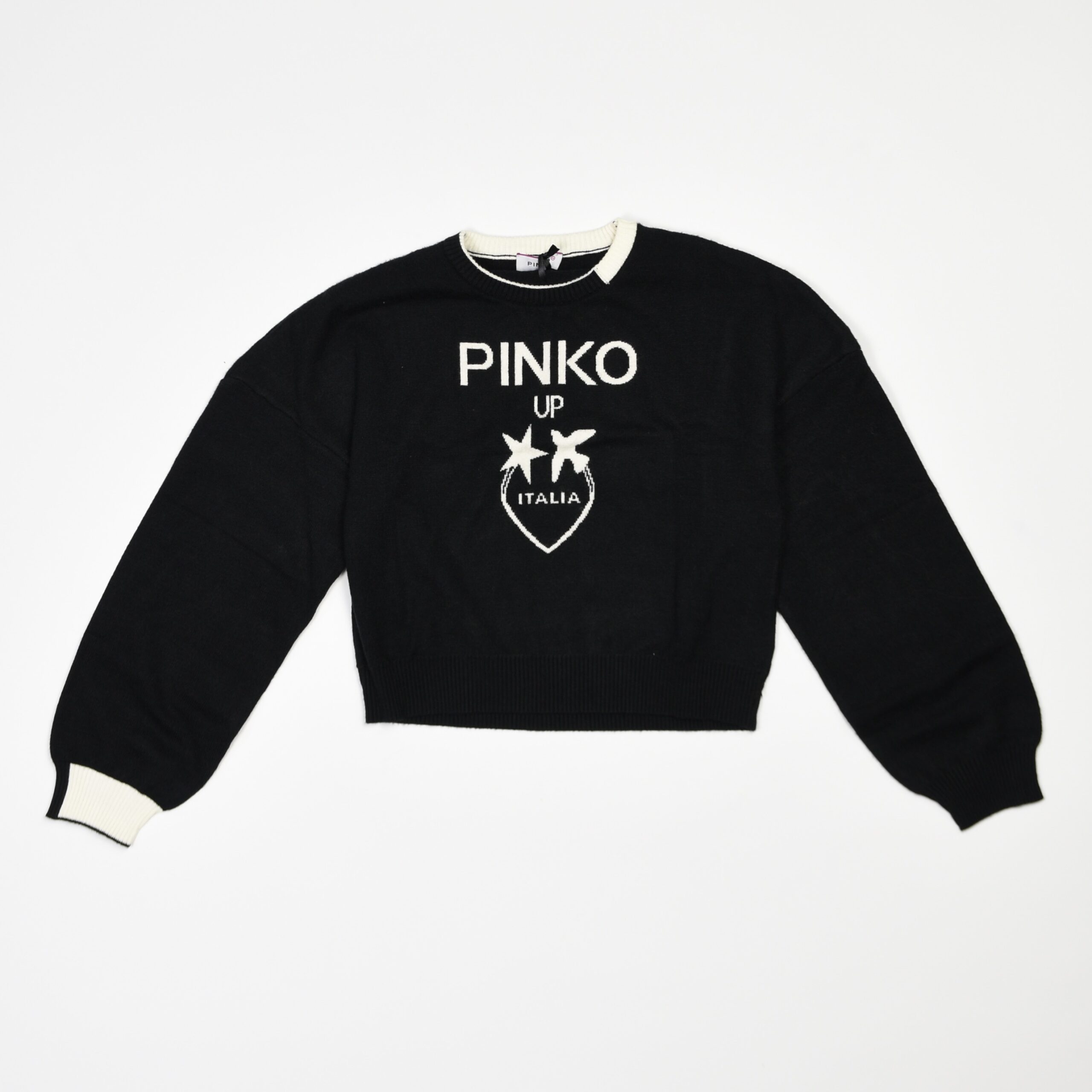 Maglia nera girocollo con dettagli in contrasto bianco su polsini e scollo. Sul fronte spicca la maxi scritta Pinko Up Italia con logo a stelle e cuore, che dona un tocco deciso e contemporaneo al capo. Realizzata in tessuto morbido e caldo, è ideale per completare look casual e grintosi con stile.