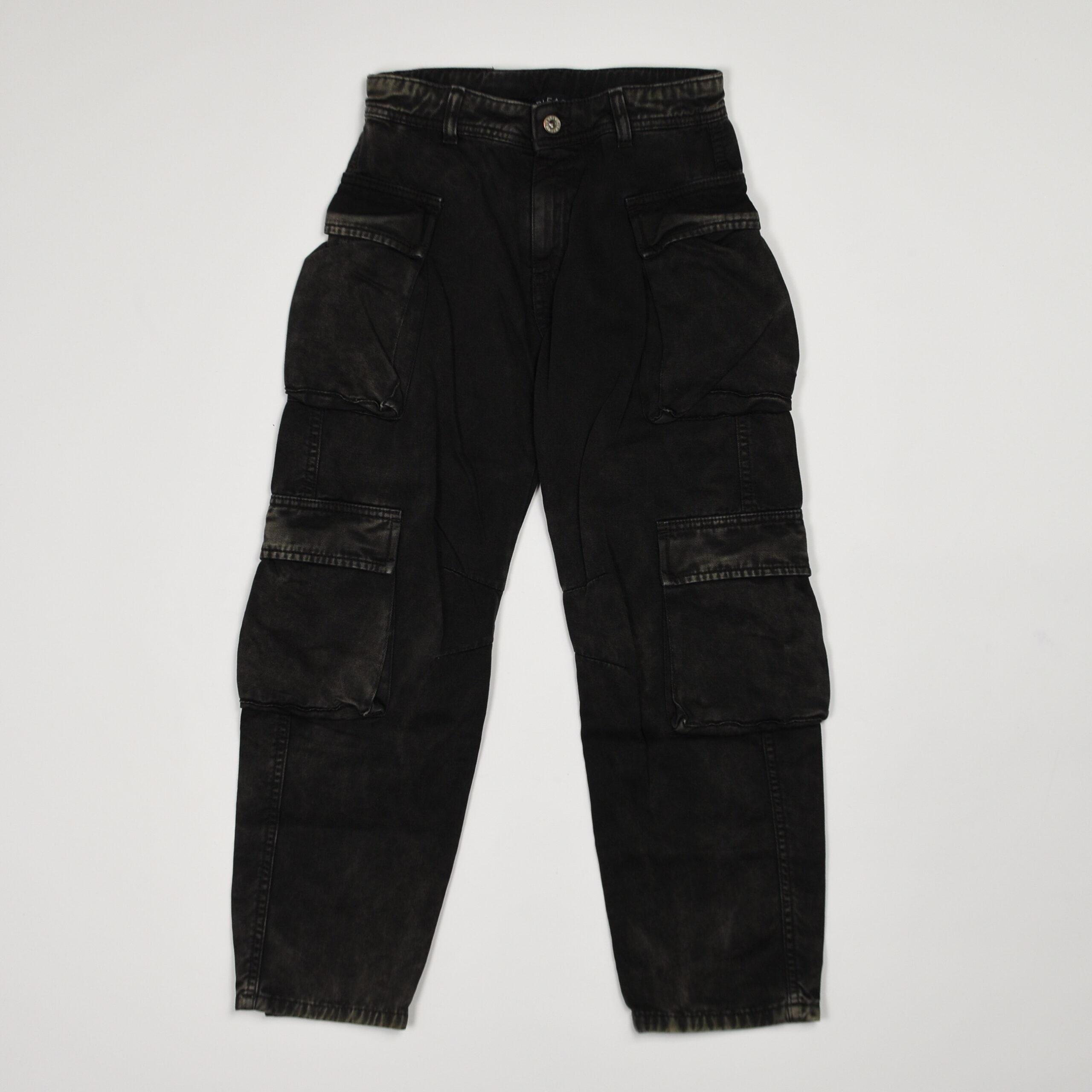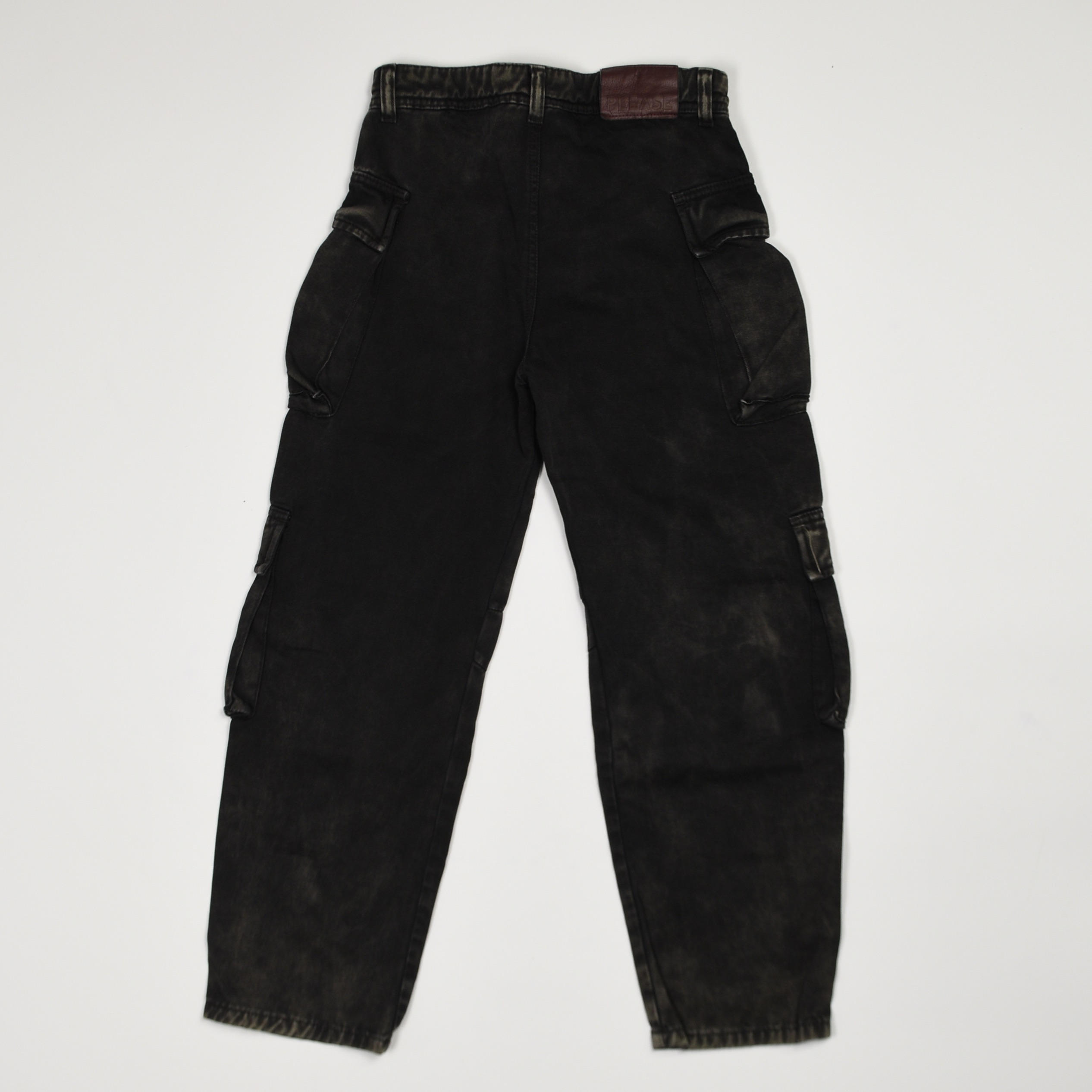 Pantalone cargo in denim, colore nero effetto vintage. Modello con chiusura a bottone e zip, passanti in vita e maxi tasconi applicati sui lati. Fondo gamba con elastico. Linea morbida e grintosa.