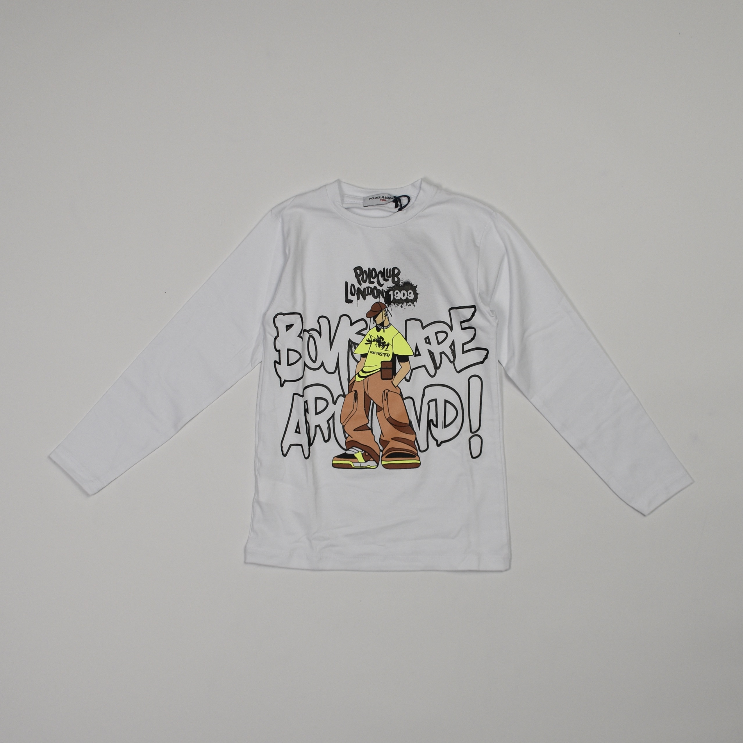 Maglia in cotone, colore bianco. Modello a maniche lunghe con girocollo e stampa frontale in stile urban con scritta grafica e personaggio cartoon. Dettaglio logo Polo Club London 1903 all’interno della stampa.
