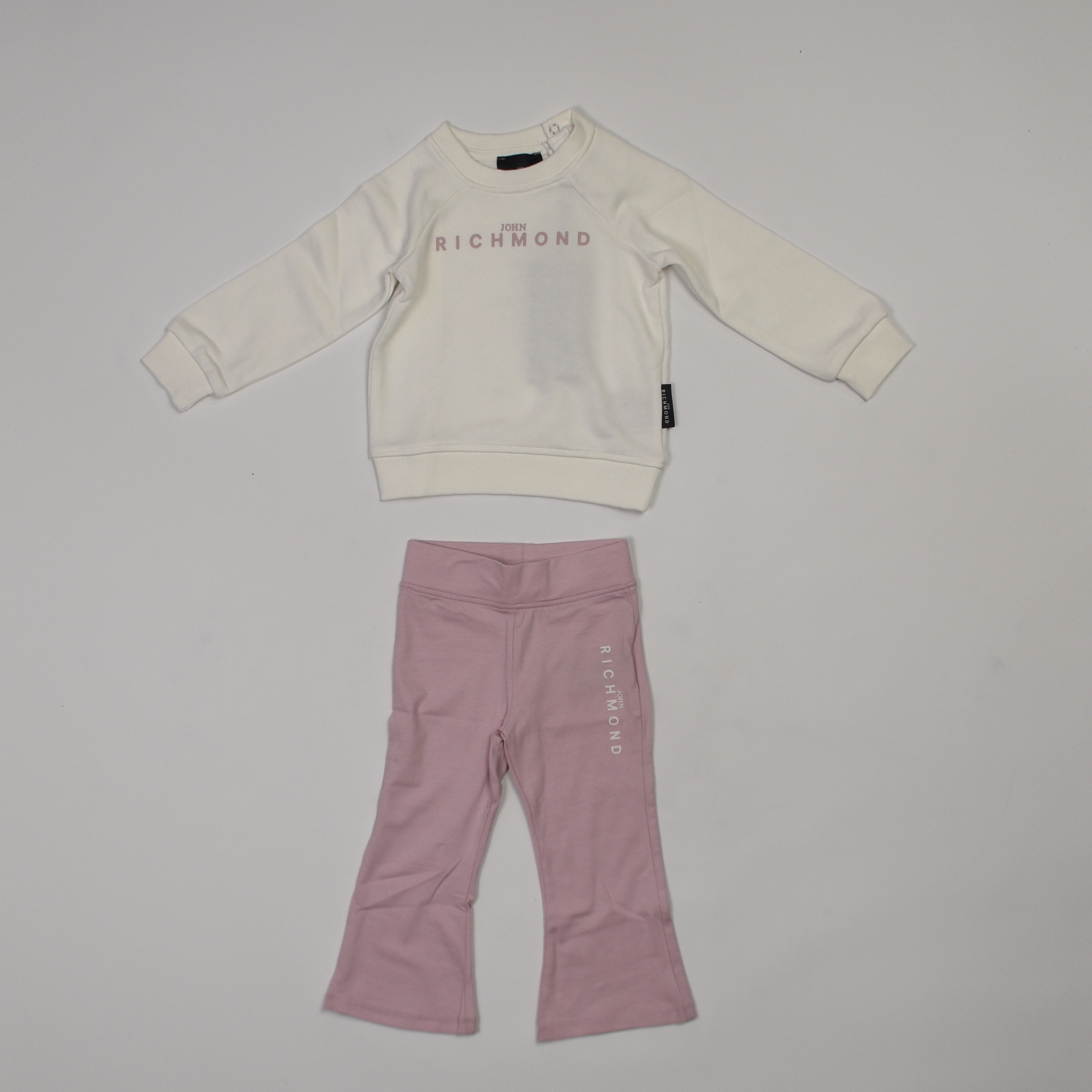 Completo due pezzi in cotone, composto da felpa girocollo a maniche lunghe in colore panna, con logo John Richmondstampato sul petto. Pantaloni abbinati a zampa, in rosa cipria, impreziositi da logo verticale stampato sulla gamba.