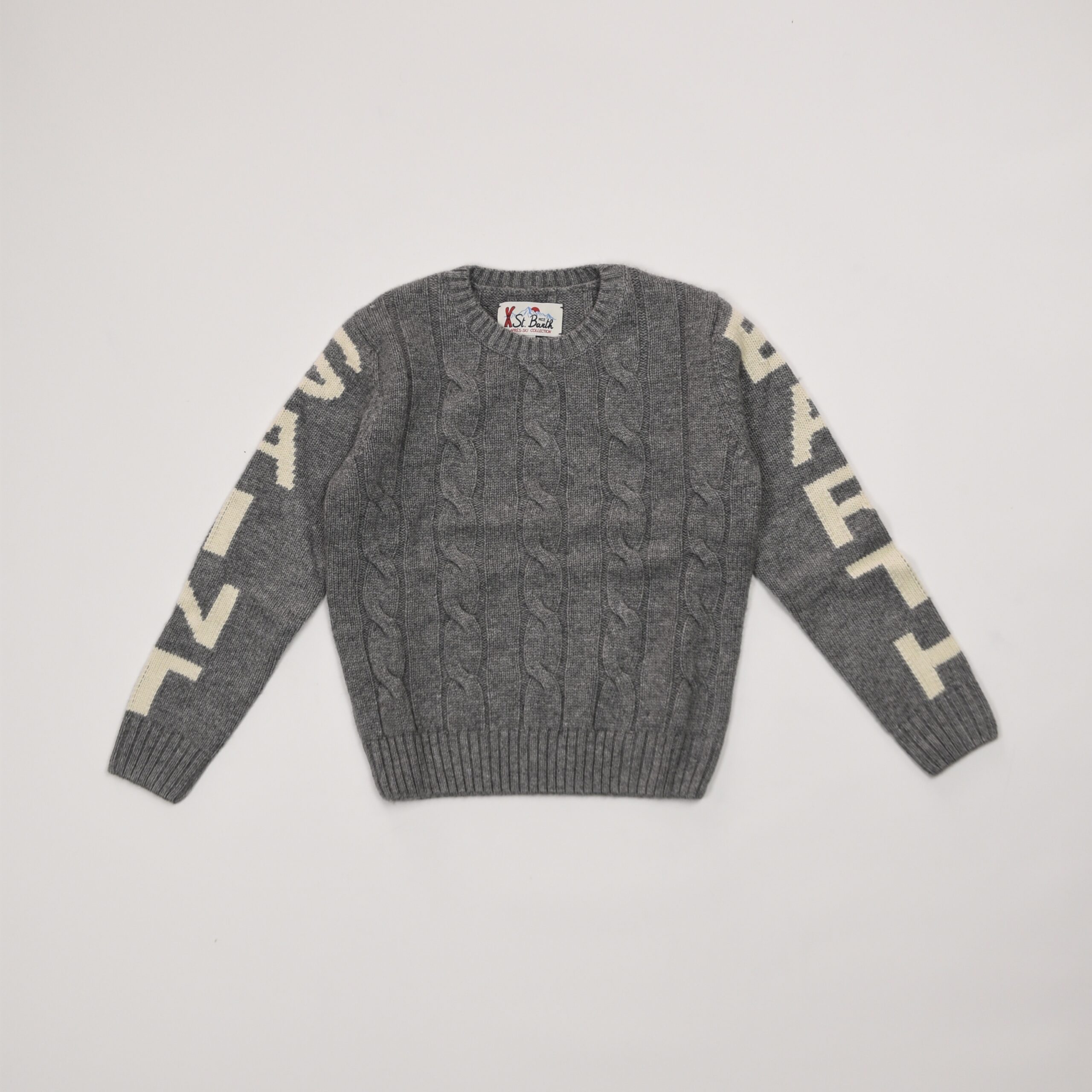 Maglione girocollo con lavorazione a trecce, realizzato in morbida maglia. Caratterizzato da logo Saint Barth a contrasto sulle maniche. Vestibilità regolare con bordi a costine su collo, polsini e fondo.