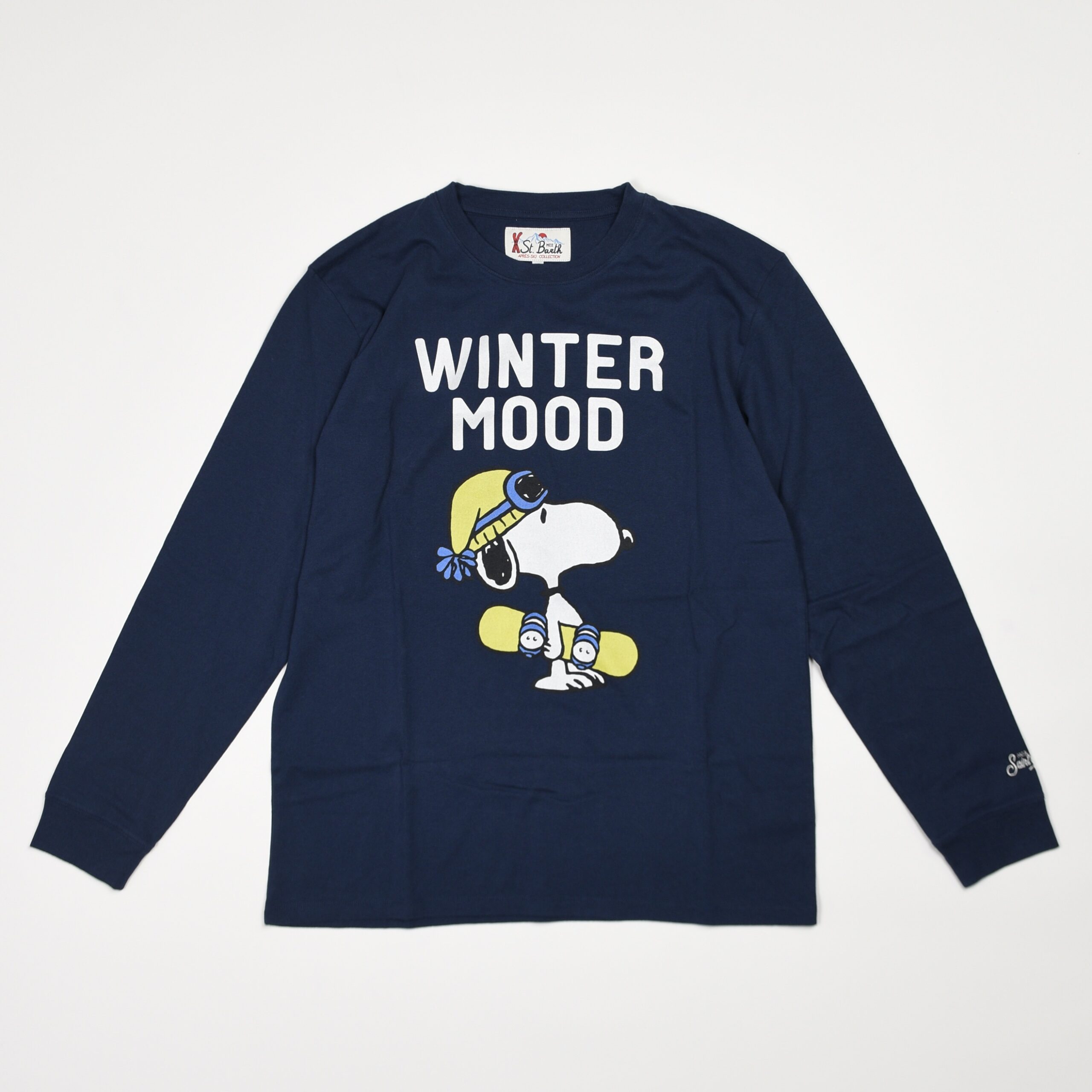 Maglia girocollo in cotone, colore blu navy. Modello a maniche lunghe con stampa frontale Snoopy e scritta Winter Moodin bianco. Logo Saint Barth ricamato sul polsino.