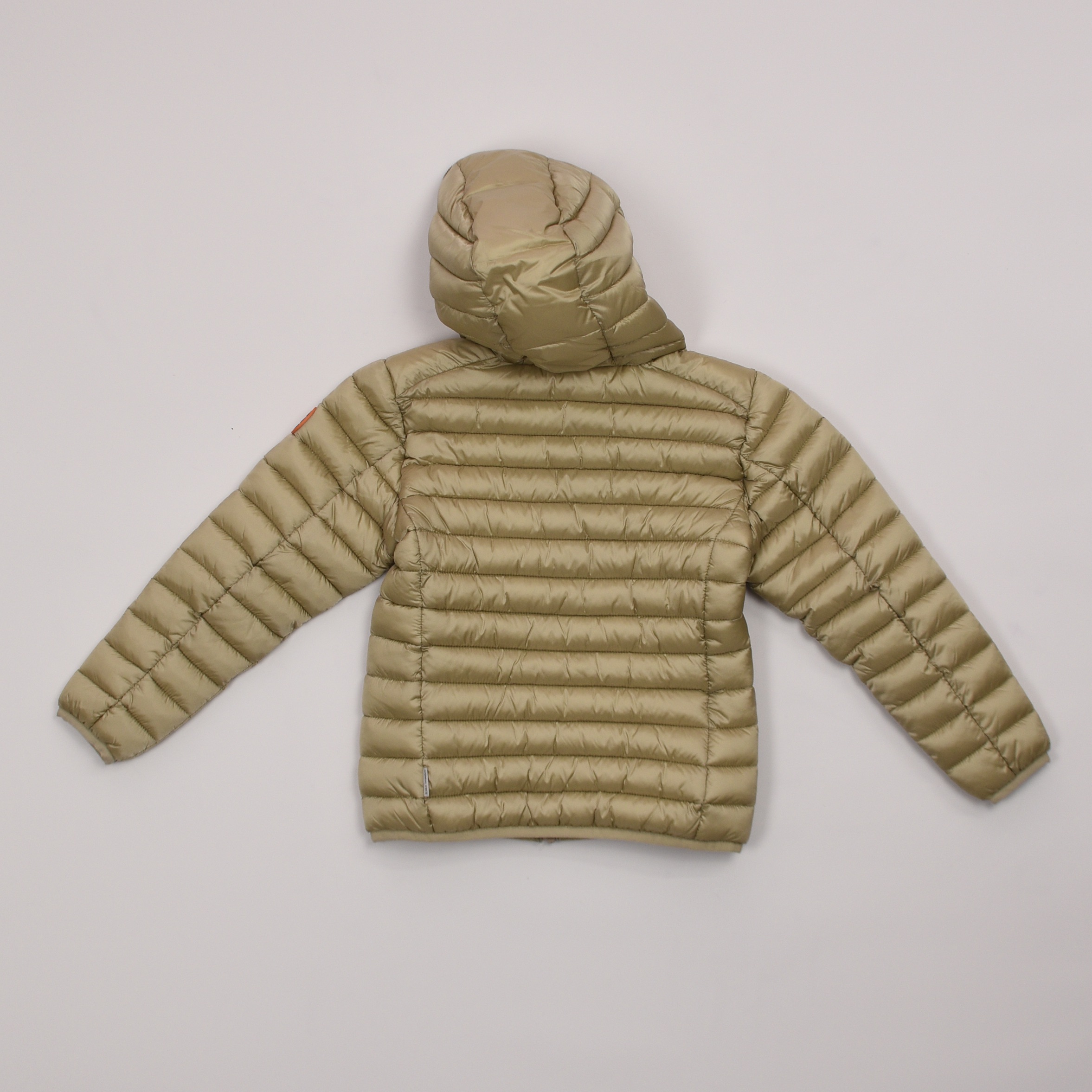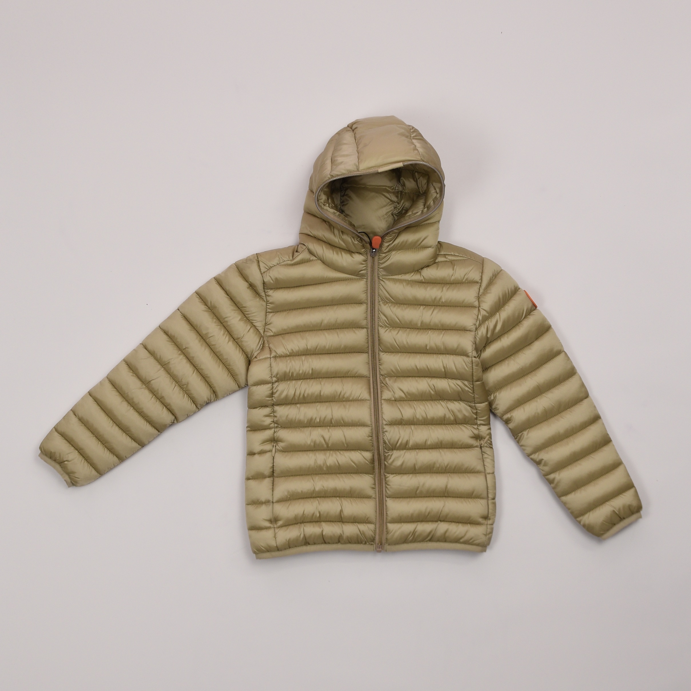 Piumino Save The Duck in color sabbia, realizzato in materiale animal free con imbottitura leggera ma calda. Il modello presenta trapuntatura orizzontale, cappuccio integrato e chiusura con zip frontale. Le tasche laterali con zip a scomparsa e il patch arancione con l’anatra sulla manica completano il design essenziale e sostenibile tipico del brand.