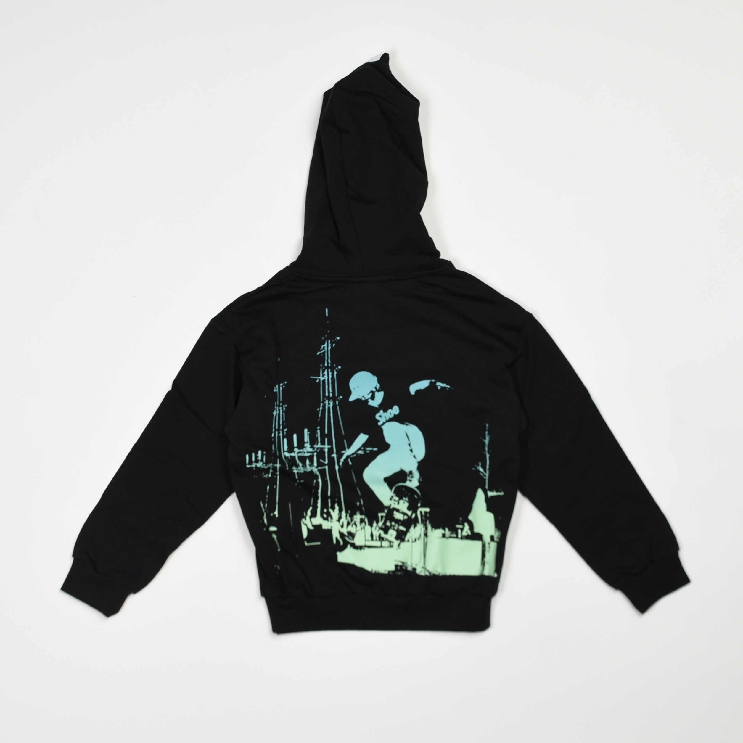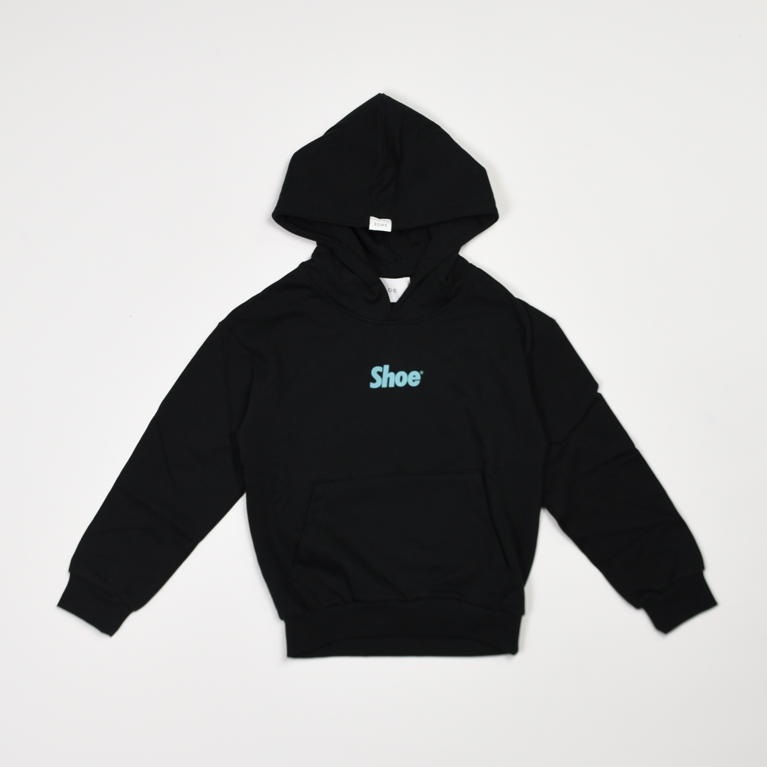 Felpa nera con cappuccio, realizzata in morbido cotone. Presenta tasca a marsupio frontale e logo azzurro “Shoe®” stampato sul petto. Sul retro, ampia grafica con skater in tonalità verde fluo e azzurro, per un look street e grintoso.