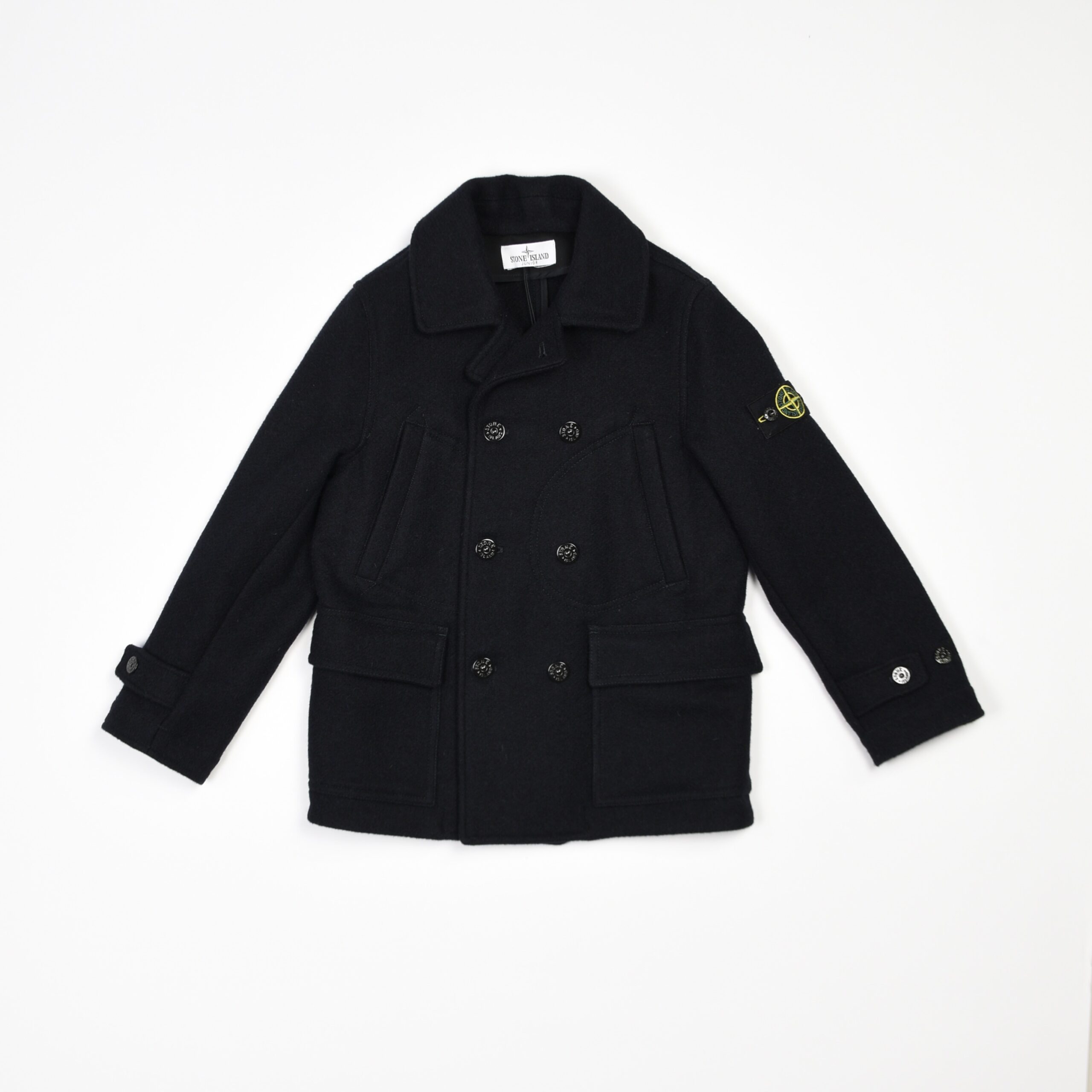 Cappotto doppiopetto Stone Island in calda lana blu navy, con chiusura a bottoni e tasche applicate frontali. Dettaglio distintivo con patch con bussola Stone Island sulla manica sinistra. Linea classica e raffinata, ideale per look eleganti ma con il carattere inconfondibile del brand.