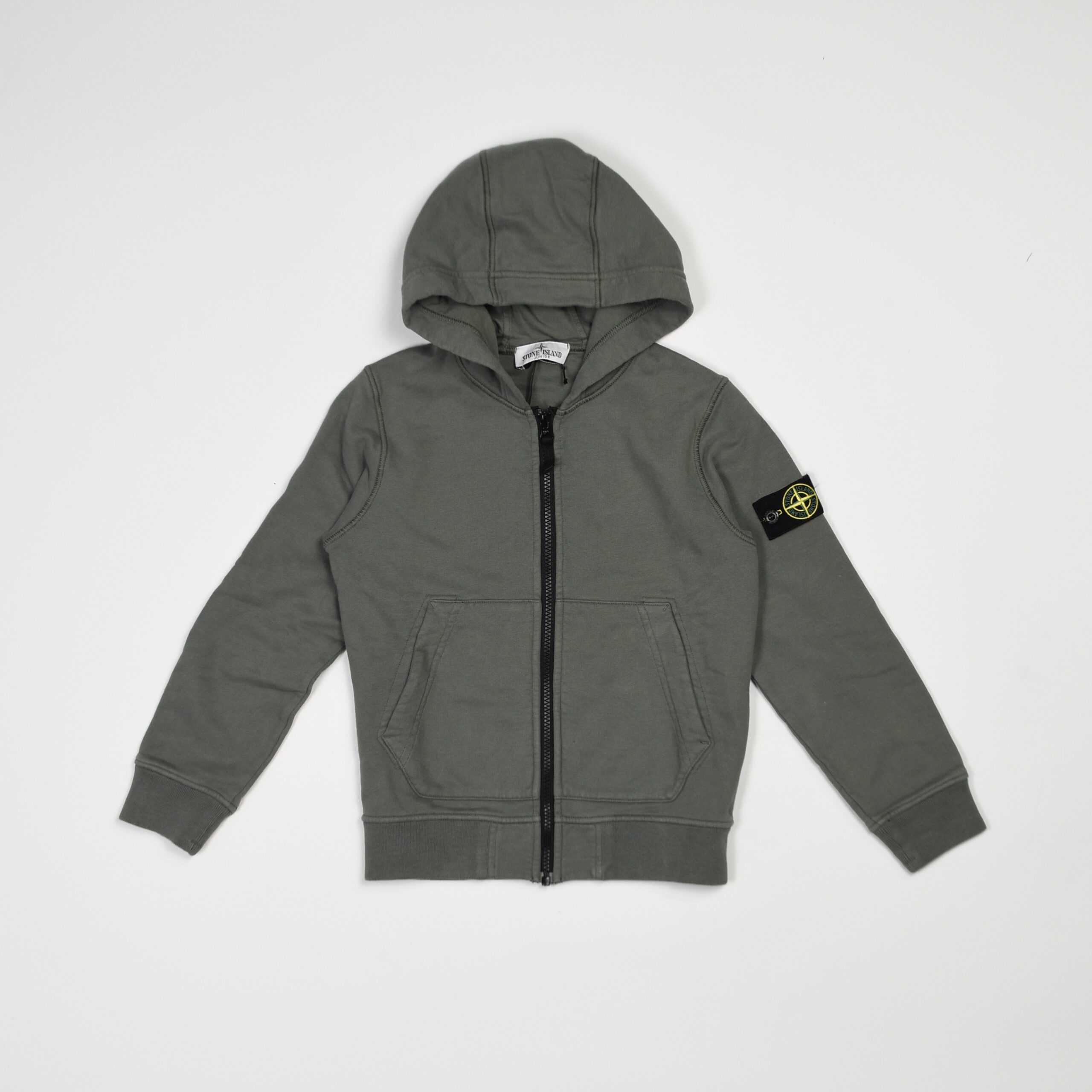 Felpa Stone Island in colore verde militare, con cappuccio e chiusura a zip frontale. Tasche a marsupio, polsini e fondo a costine. Patch logo iconica con bussola applicata sulla manica sinistra.