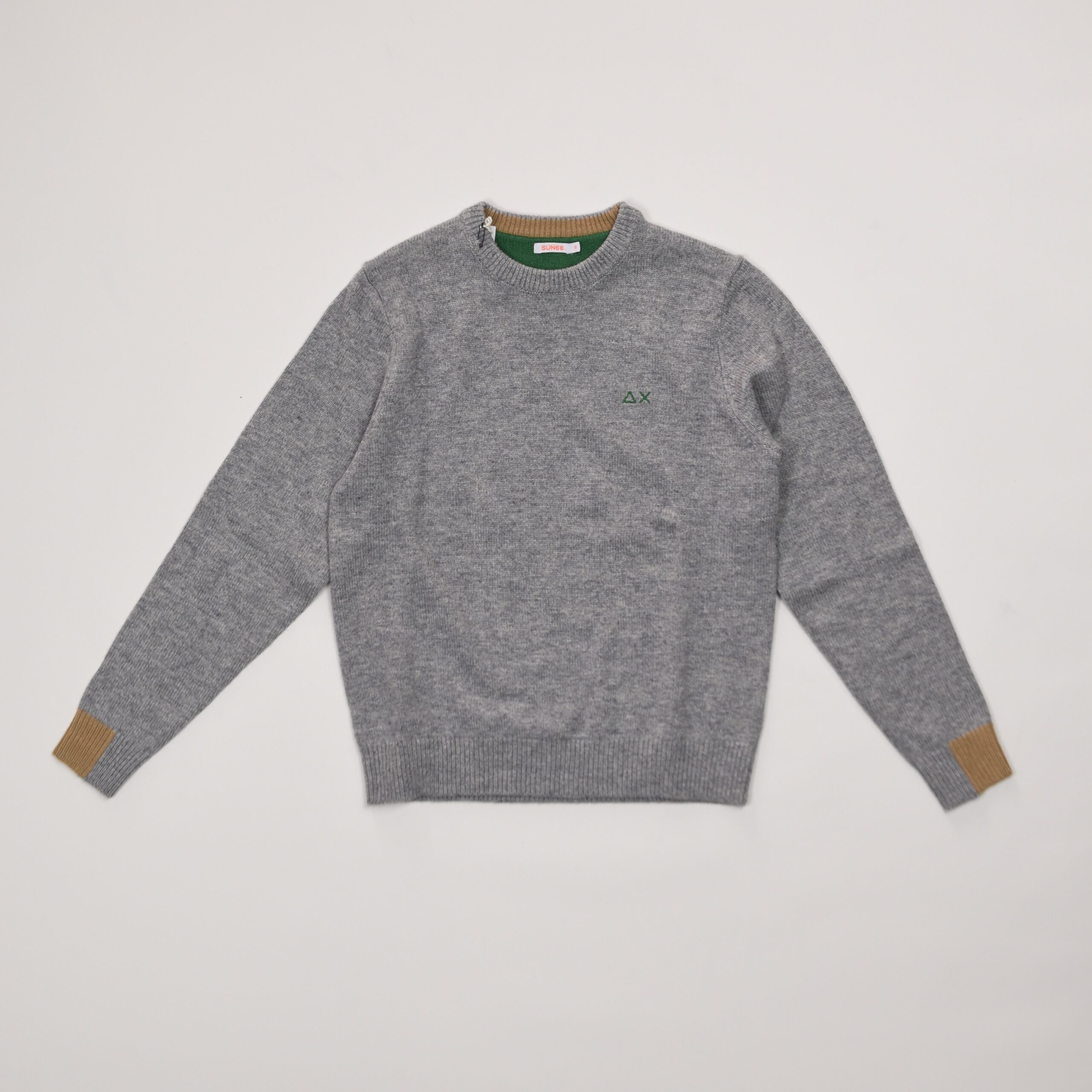 Maglione girocollo in maglia fine, colore grigio mélange. Dettagli a contrasto sui polsini color cammello e interno collo verde. Logo ΔX ricamato sul petto in verde. Modello a manica lunga con vestibilità regolare e bordi a costine.