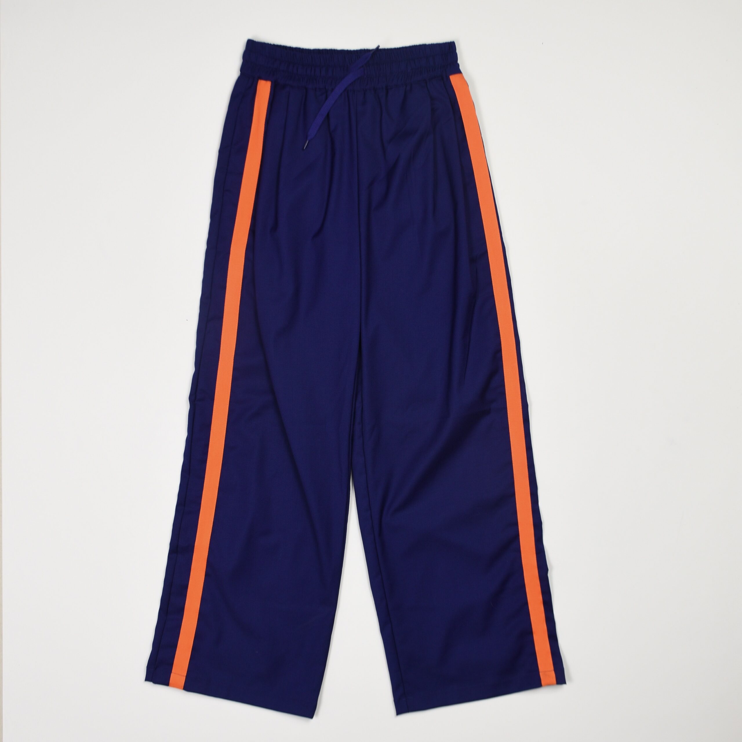 Pantaloni sportivi in tessuto tecnico di colore blu. Modello a gamba dritta con vita elasticizzata e coulisse regolabile. Caratterizzati da bande laterali a contrasto in arancione fluorescente.