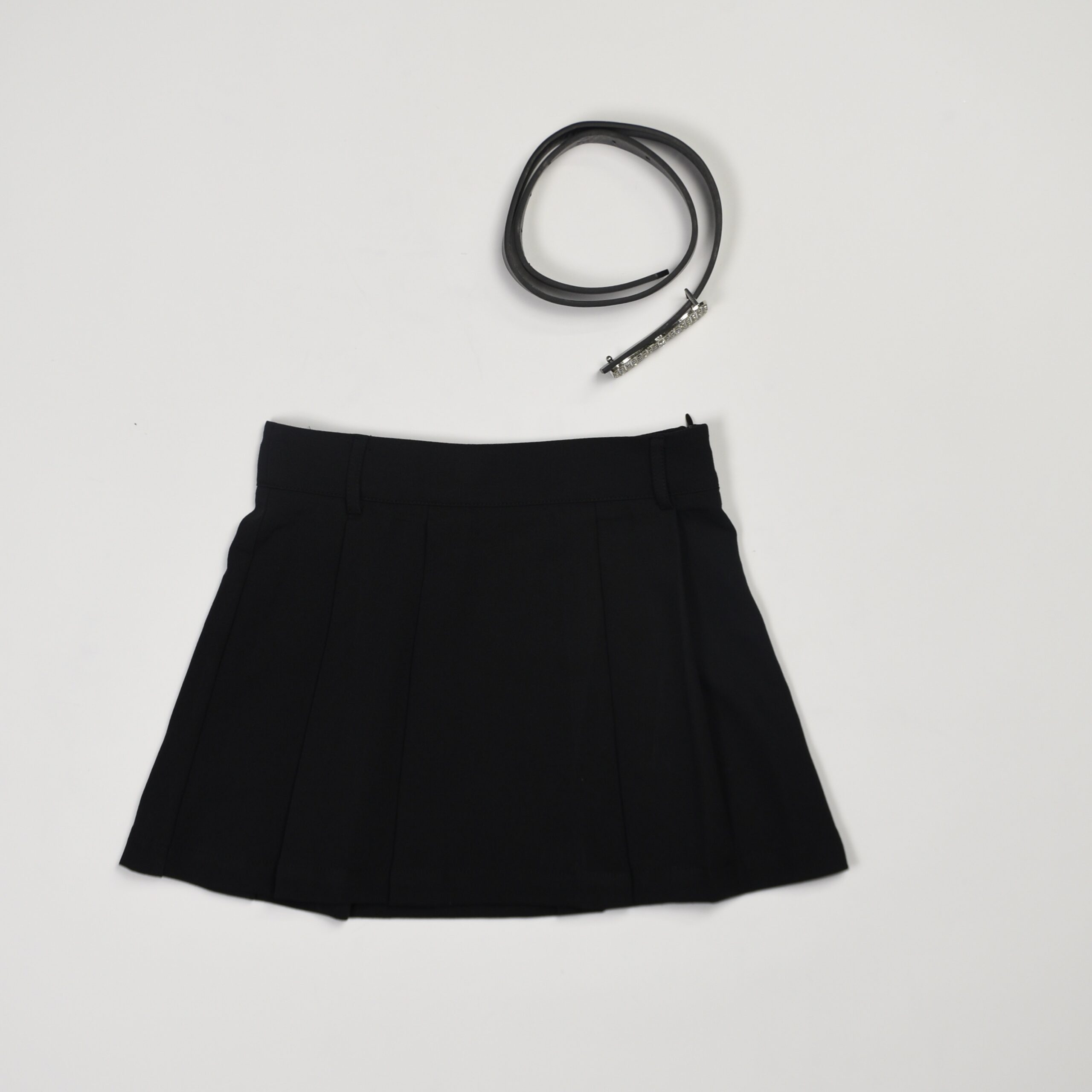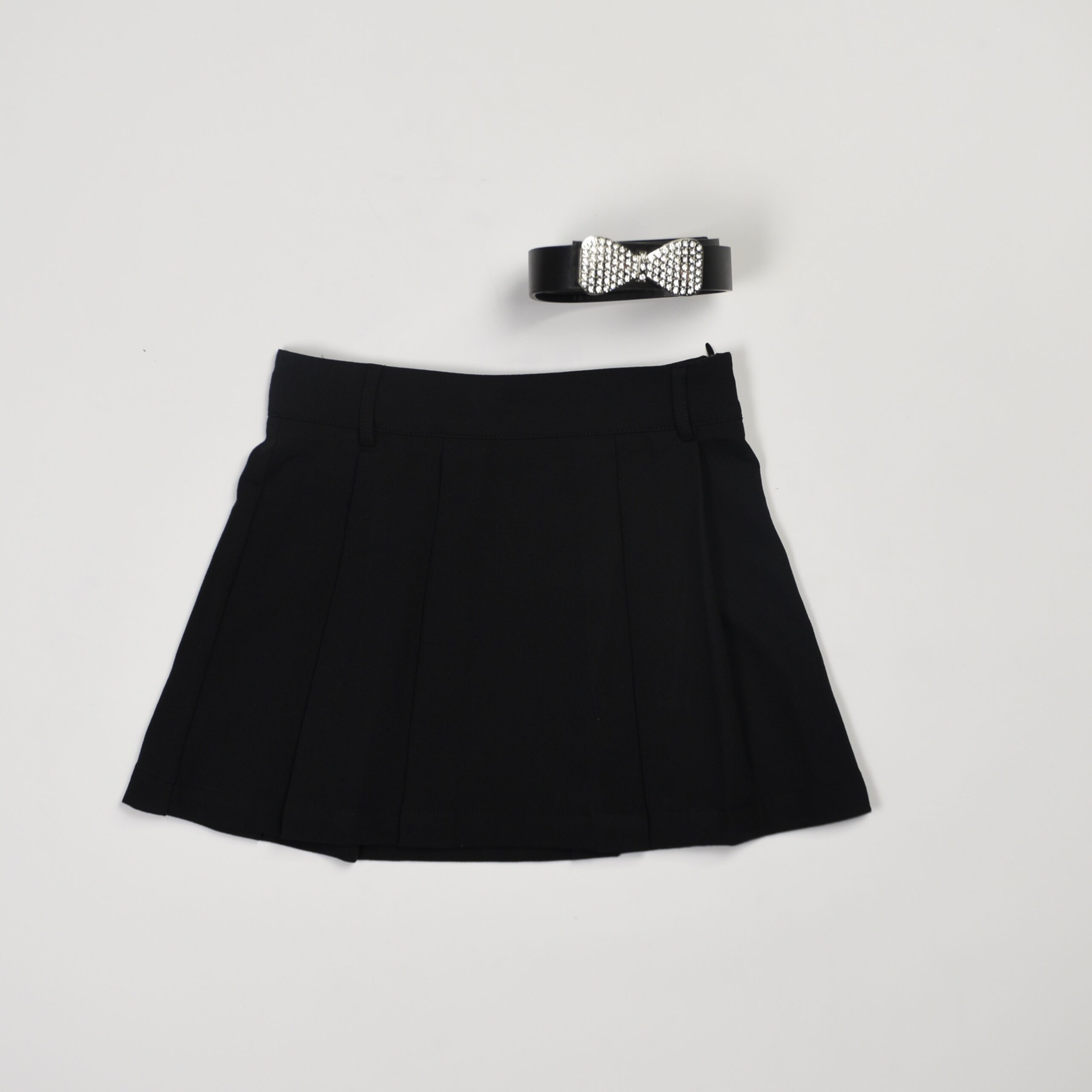 Gonna corta nera a pieghe, con passanti in vita e chiusura laterale. Completa di cintura in abbinato con fibbia a fiocco tempestata di strass luminosi.