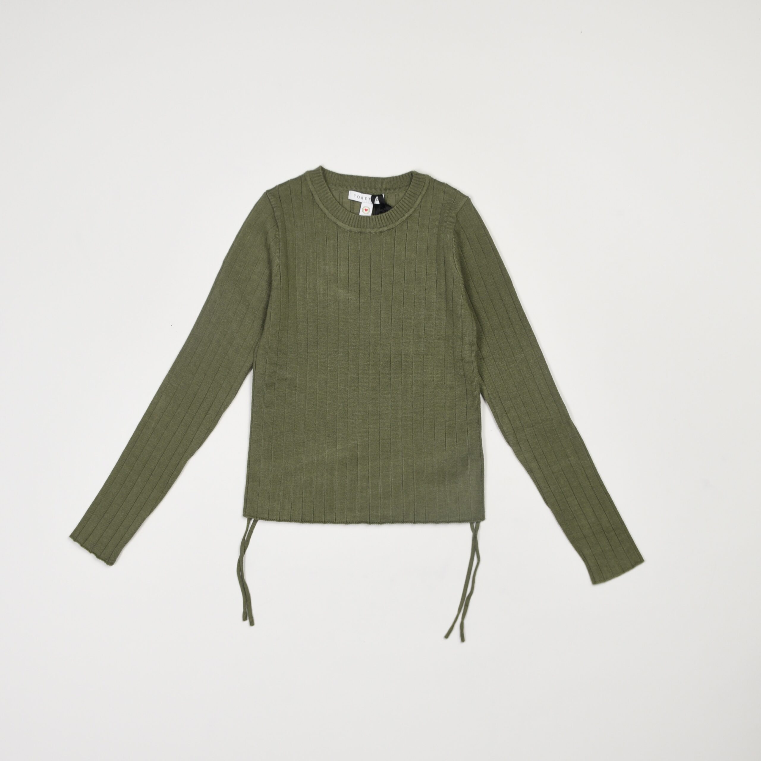 Maglia a maniche lunghe in maglia verde militare con lavorazione a costine verticali. Modello girocollo con lacci regolabili sul fondo ai lati.