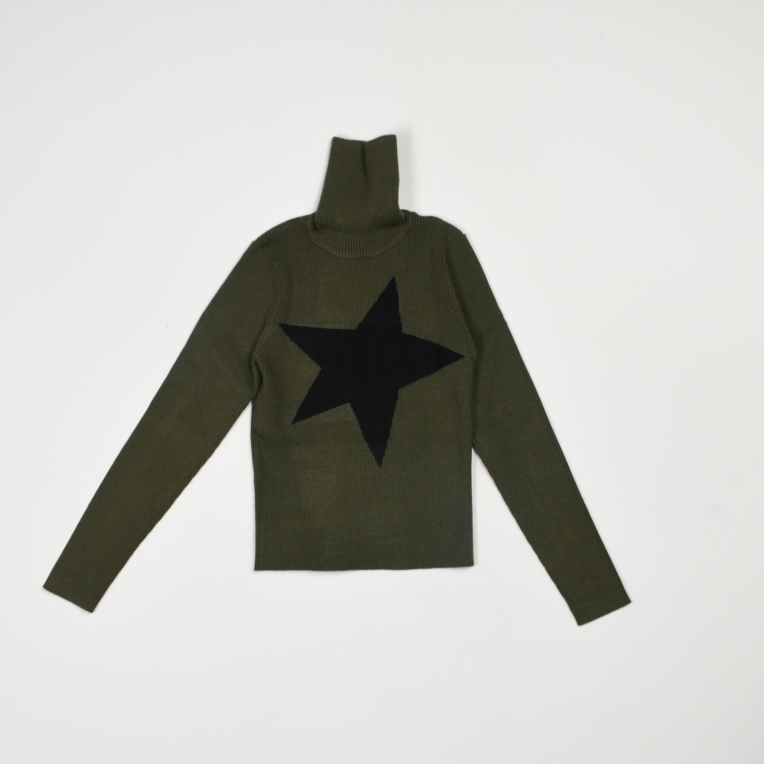 Maglia dolcevita a maniche lunghe in maglia verde militare. Modello slim fit con lavorazione a costine e maxi stella nera a contrasto sul davanti.