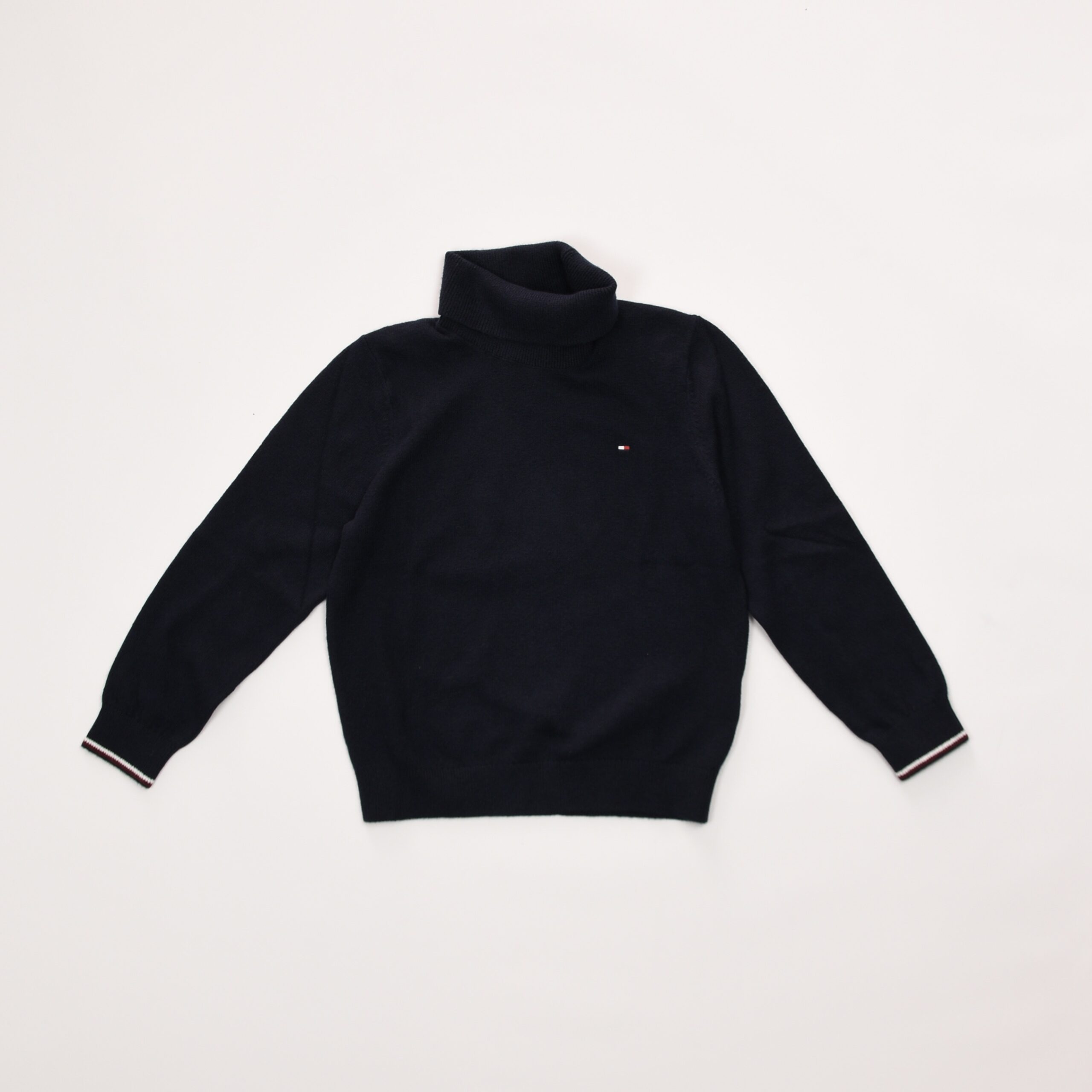Maglione dolcevita a manica lunga in maglia fine, colore blu navy. Logo Tommy Hilfiger ricamato sul petto e dettagli iconici tricolore sui polsini. Modello con vestibilità regolare e collo alto a coste, ideale per i look invernali eleganti e casual.