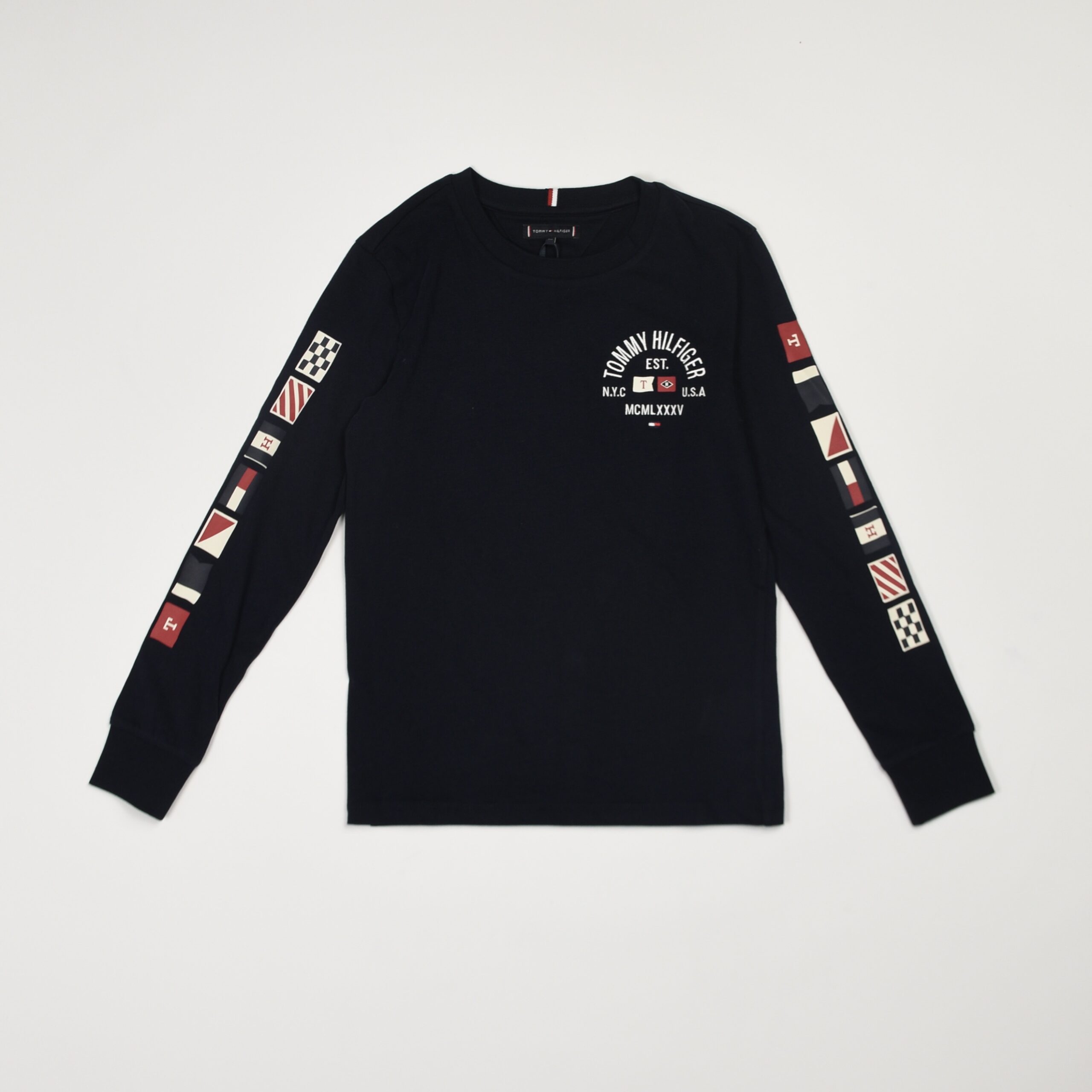 Maglia in cotone a maniche lunghe di colore blu navy. Presenta stampa logo Tommy Hilfiger con dettagli grafici sul petto e bandiere nautiche stampate lungo entrambe le maniche. Colletto girocollo e polsini elasticizzati.